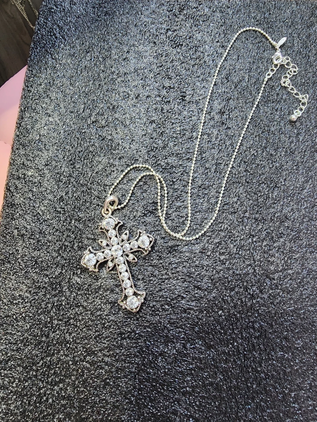 Selling a cross pendant necklace. It's in great condition and features a silver-tone chain with a cross pendant adorned with clear stones. It would be a great addition to any outfit!