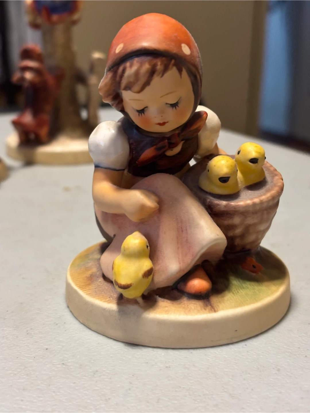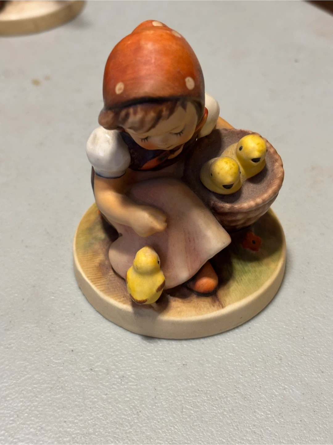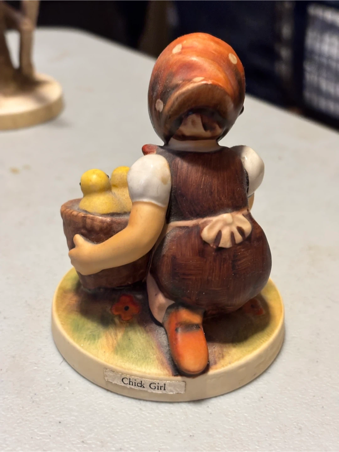 Selling a Goebel Hummel figurine called "Chick Girl"! It's in great condition and features a sweet girl holding a basket of chicks. The bottom of the figurine is marked with the Goebel logo and "W. Germany".