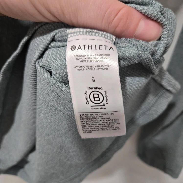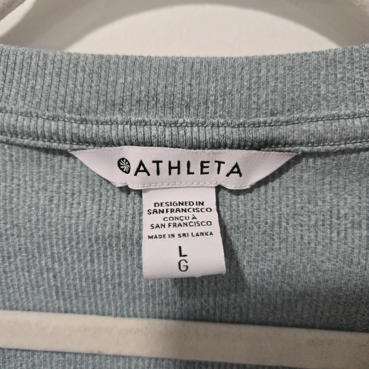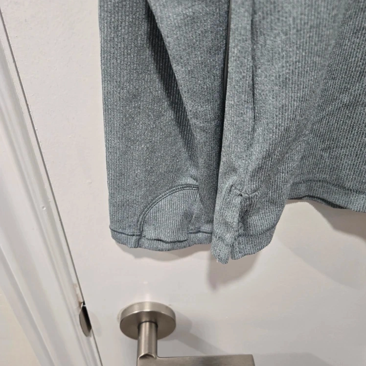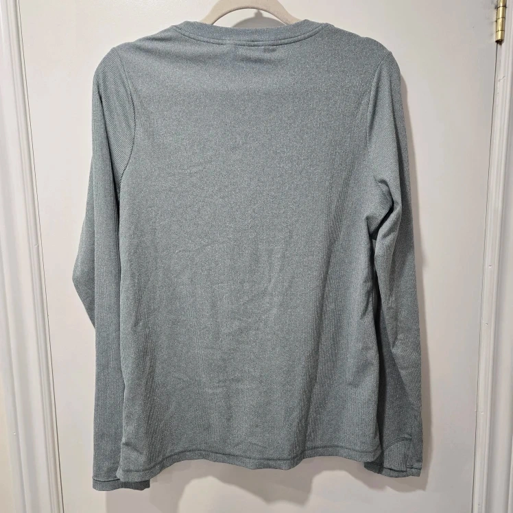 Light teal ribbed athletic material. Longsleeved. Henley neckline with buttons on the front. Thumbholes at the wrists. Longer length body.
