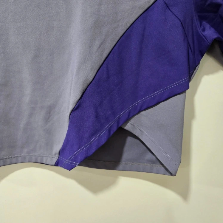 Flattering form fitting cropped t-shirt. Longer length sleeves. Asymmetric cut out details on the side. Colourblock panels grey-purple and royal blue.