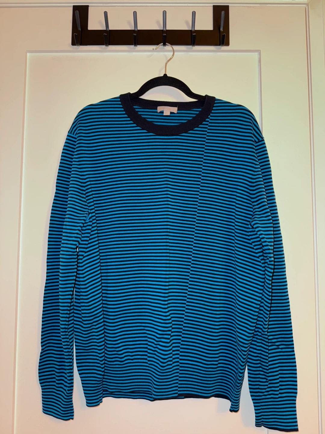 Here's a COS striped knit sweater in size XL! It features a unique striped design in blue and black. Perfect for adding a pop of colour to your wardrobe!