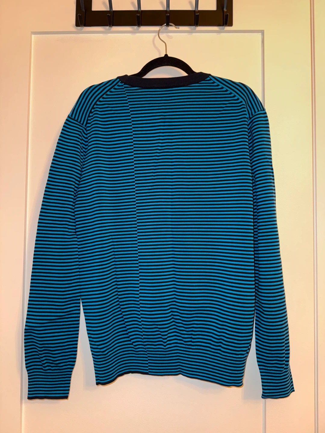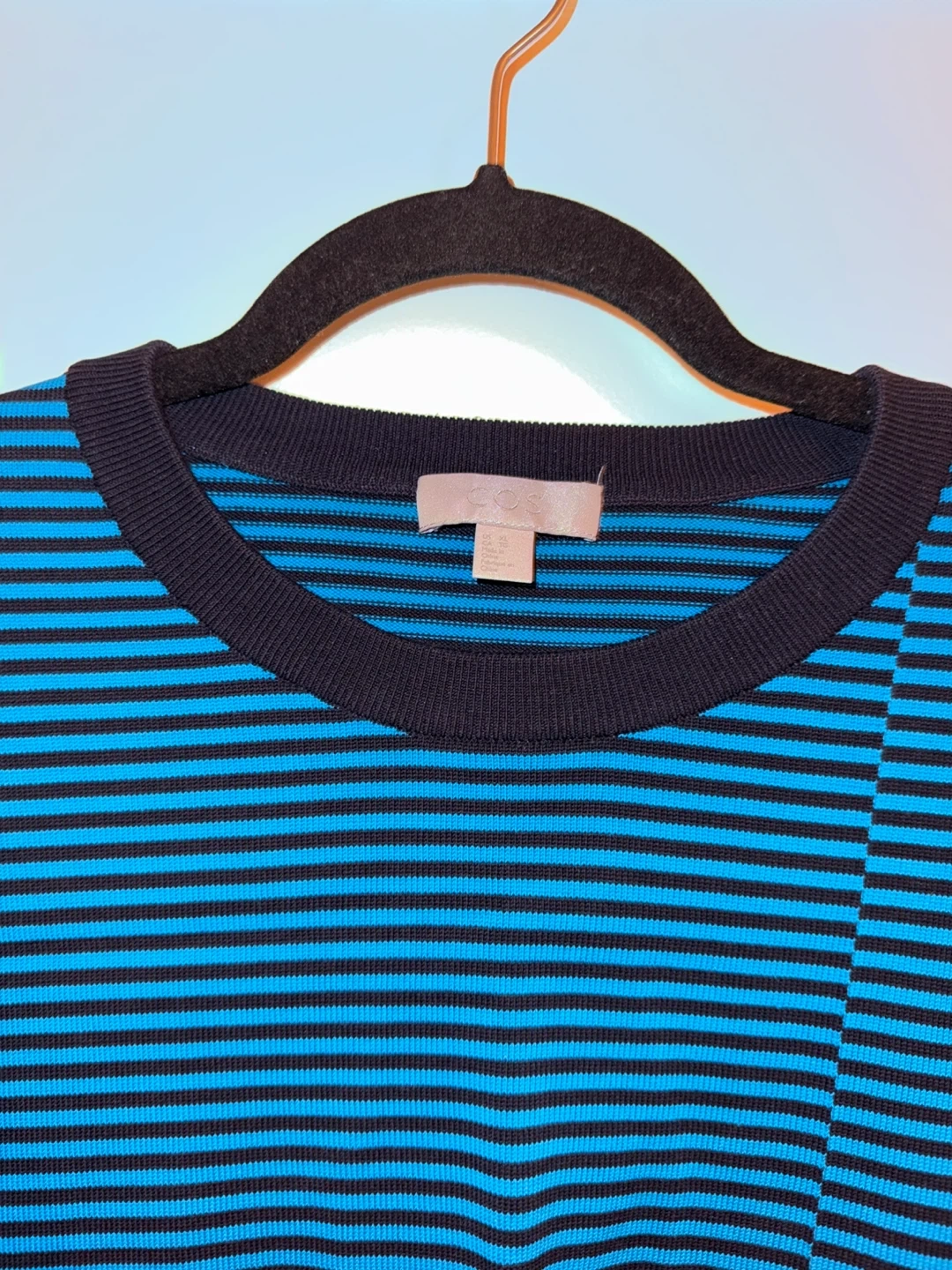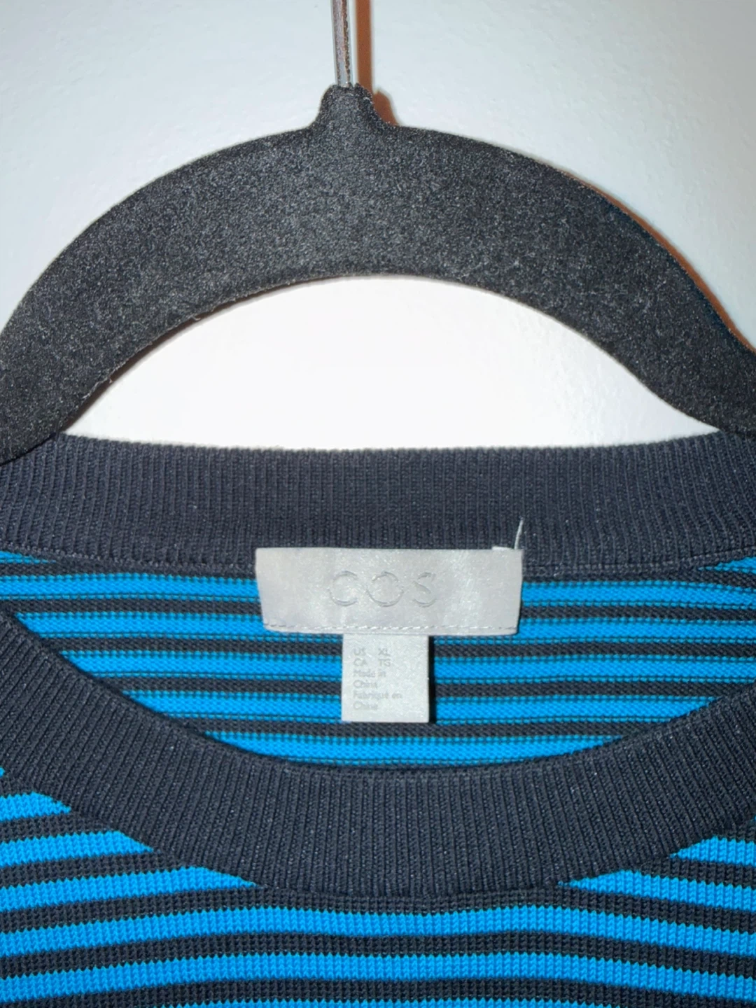 Here's a COS striped knit sweater in size XL! It features a unique striped design in blue and black. Perfect for adding a pop of colour to your wardrobe!