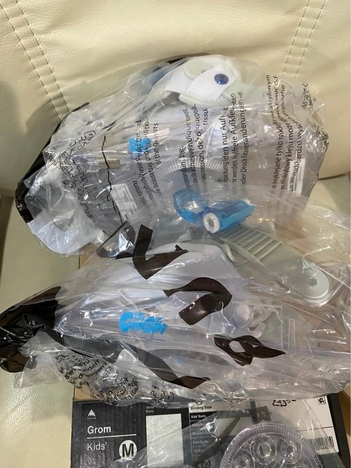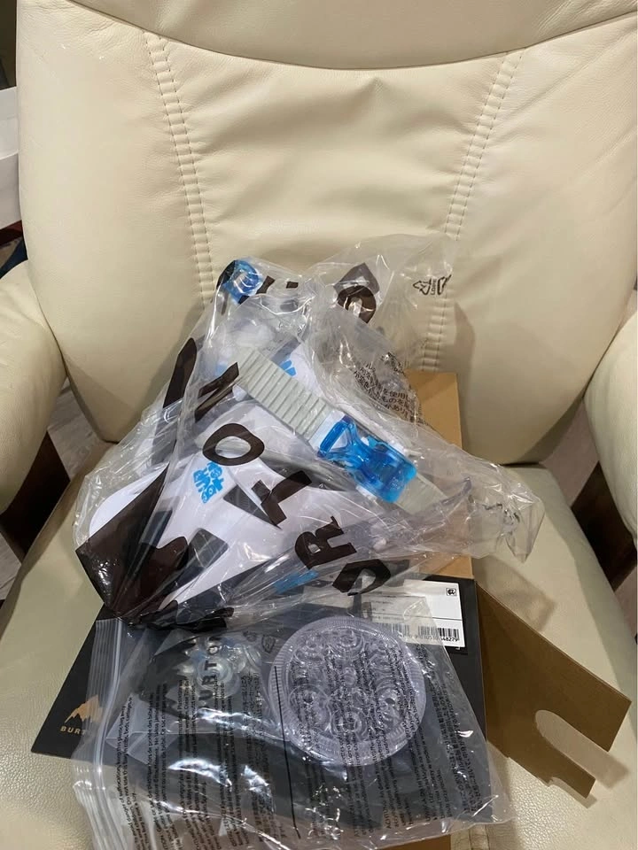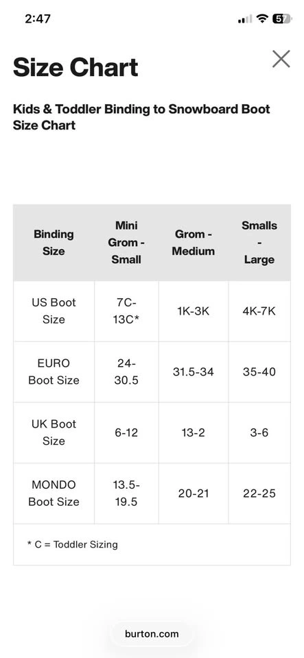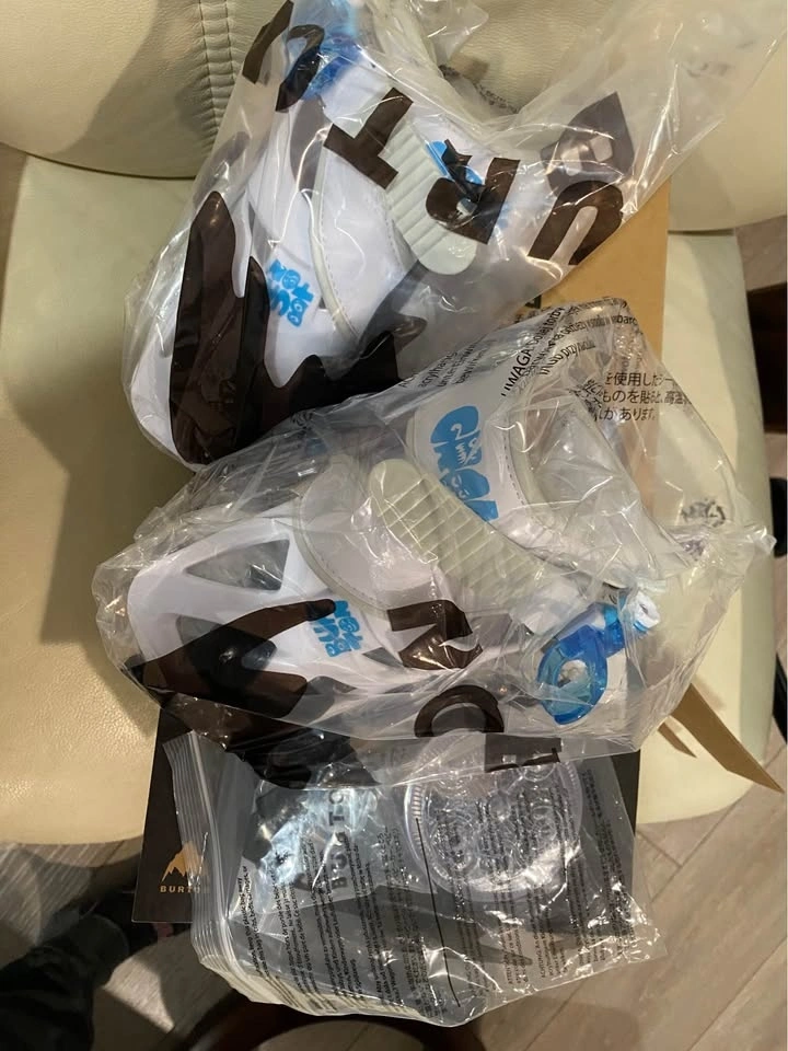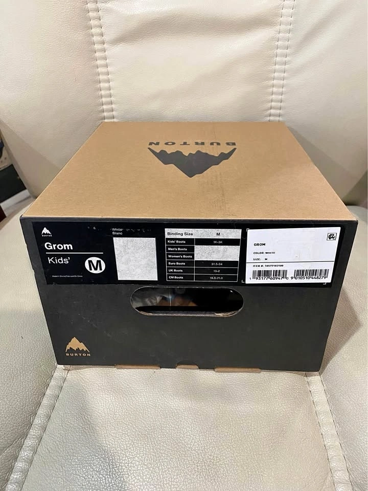 Brand new, white Burton Grom snowboard bindings, size M, with original packaging and accessories. Euro size 31.5-34, UK size 13-2, CM size 19.5-21.0. Includes all original parts and instructions.