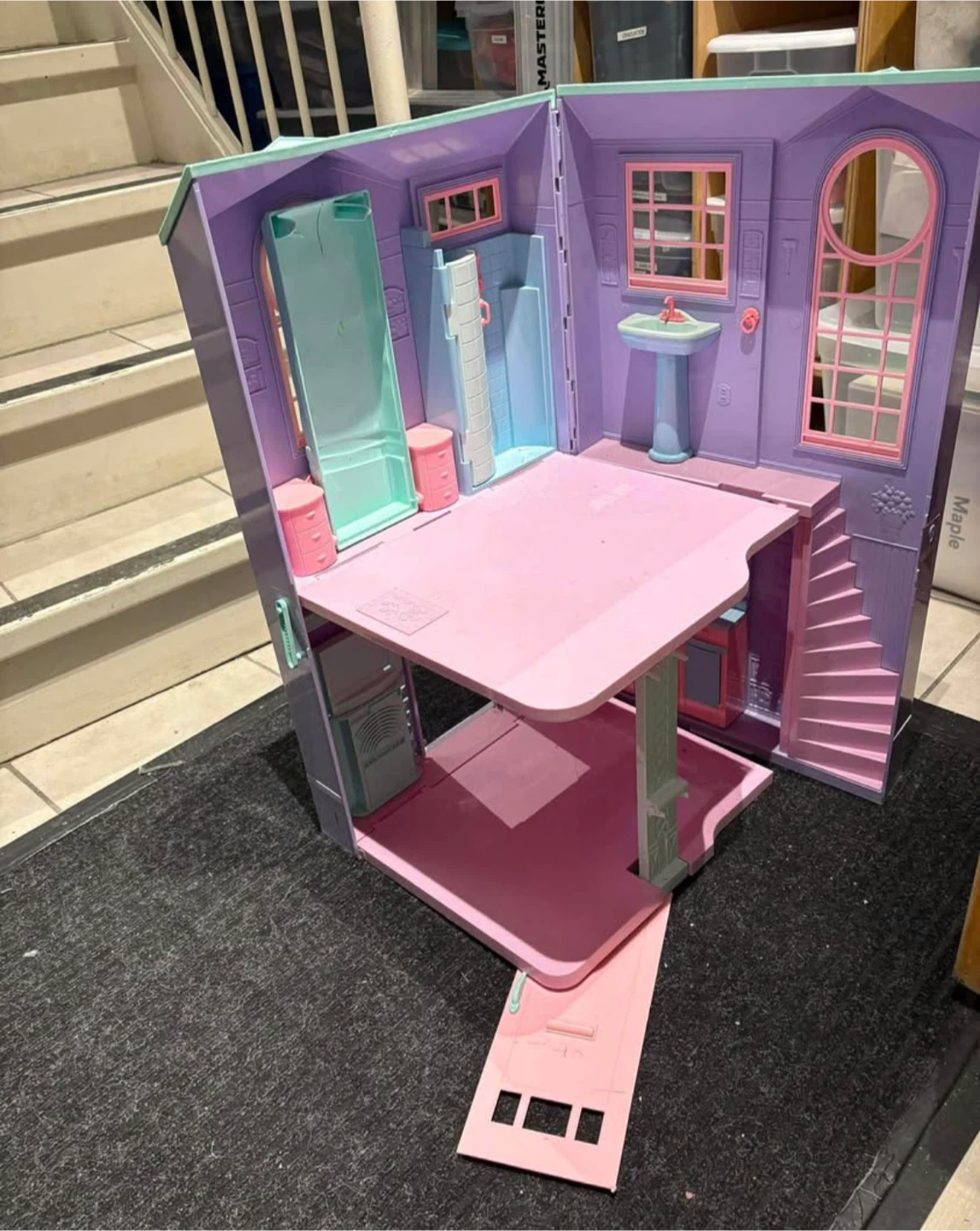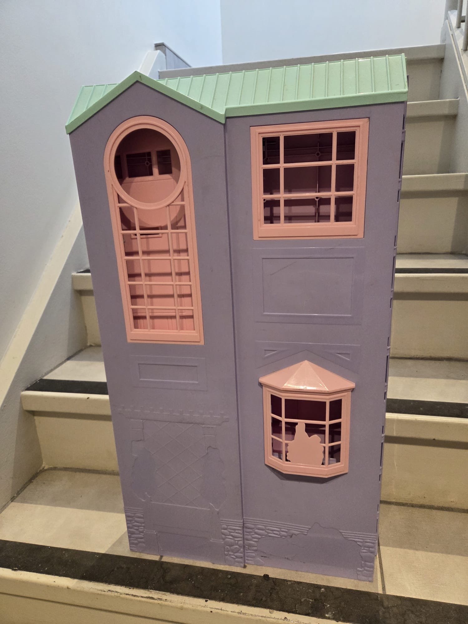 Retro fold-out townhouse with working doors, fold-down bed, table, media unit, oven and dishwasher (all open as they should). Lights and sounds no longer work. House only, no dolls or accessories