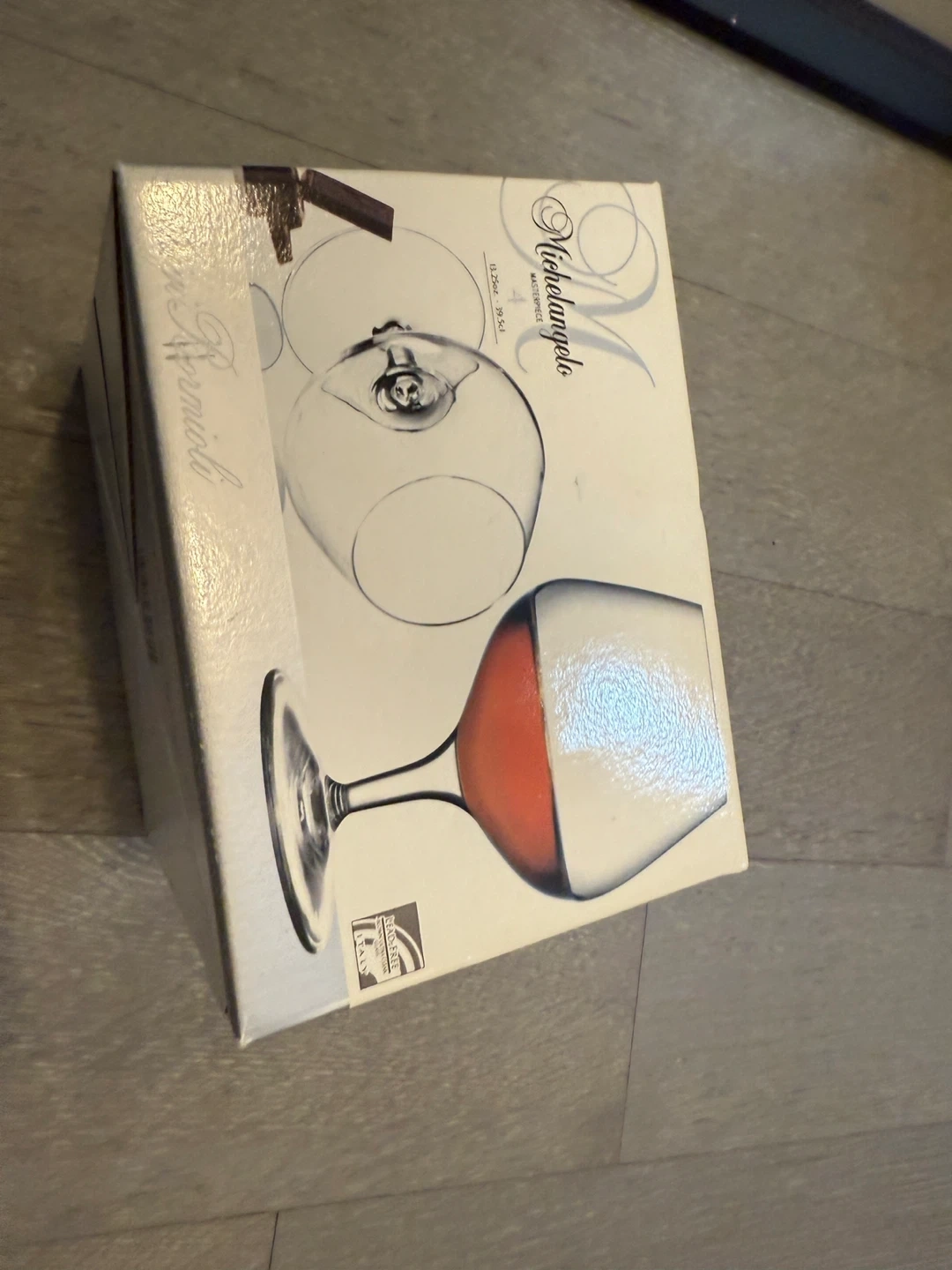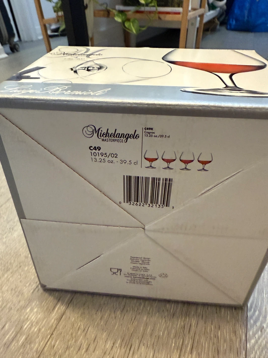 Selling a set of Michelangelo Masterpiece brandy glasses! The box indicates they are 13.25 oz / 39.5 cl. The box also indicates they were originally $24.99 and made in Italy