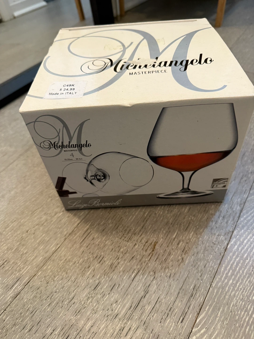 Selling a set of Michelangelo Masterpiece brandy glasses! The box indicates they are 13.25 oz / 39.5 cl. The box also indicates they were originally $24.99 and made in Italy