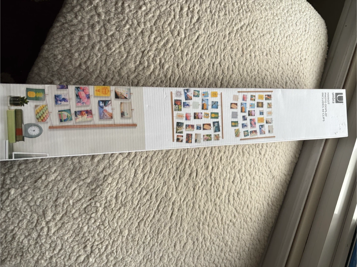 Selling an Umbra Hangit displa! It's a super cute way to display photos, cards, artwork etc. Easy to change up and wall mount, includes 6 twine cords and 40 removable clothespins.