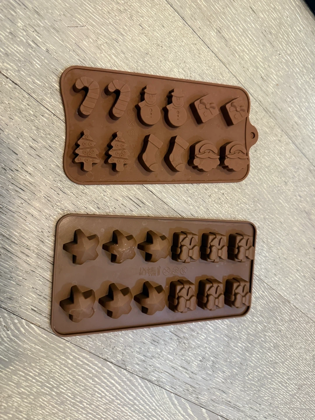 I'm selling two silicone molds! One features Christmas-themed shapes like candy canes, snowmen, Christmas trees, stockings, and Santa faces. The other mold has star and gift box shapes. Perfect for making chocolates or other treats!