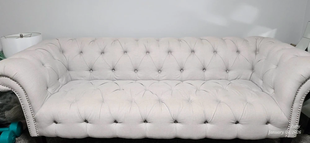 Selling a beautiful tufted Chesterfield sofa in light grey! This sofa features classic Chesterfield styling with button-tufted detailing and elegant rolled arms. It would make a great addition to any living room or seating area