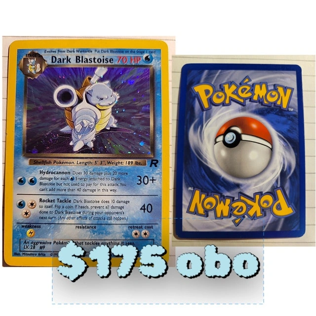 This is a used Dark Blastoise Pokémon card with Hydrocannon and Rocket Tackle. The card is in NM condition. Here are the card's specifications: * Shellfish Pokémon * Length: 5' 3" * Weight: 189 lbs * An aggressive Pokémon that tackles anything it sees. * LV. 28 #9 I have looked at recent sales of similar cards and am pricing it competitively. If the ad is up, the card is still available!