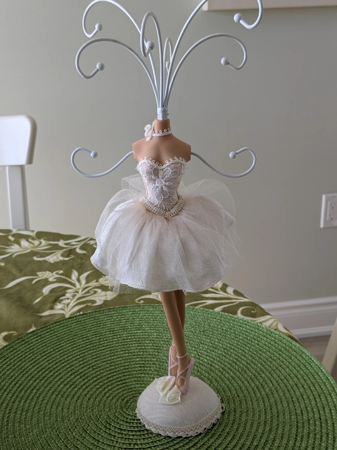 This charming jewelry organizer is shaped like a ballerina. It features a wire rack for hanging necklaces and earrings. The base is padded with lace trim.