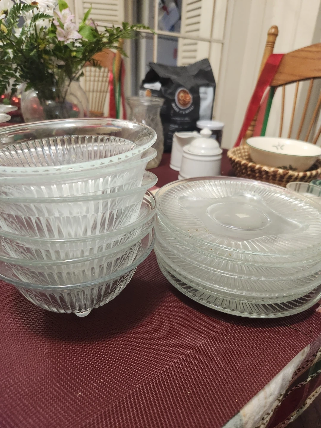 Selling a set of clear glass dessert bowls and plates. 6 of each. Plates are 7 'inch diameter. These have a lovely vintage look with their ribbed design. Perfect for adding a touch of elegance to your dessert service!