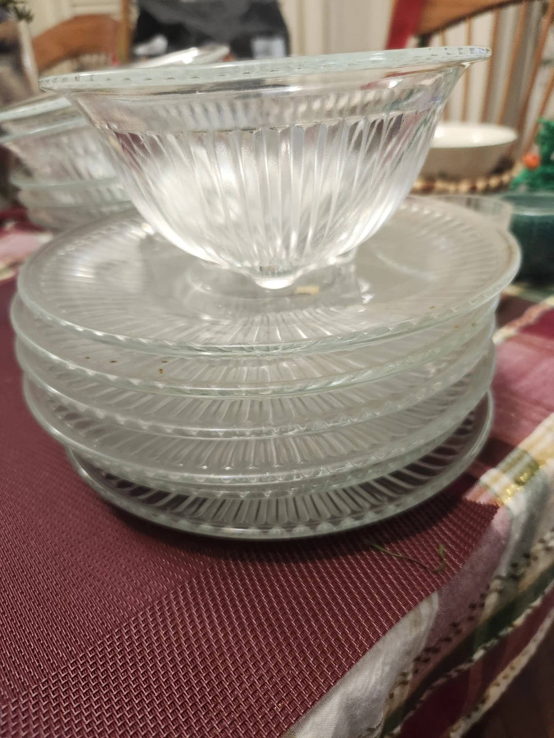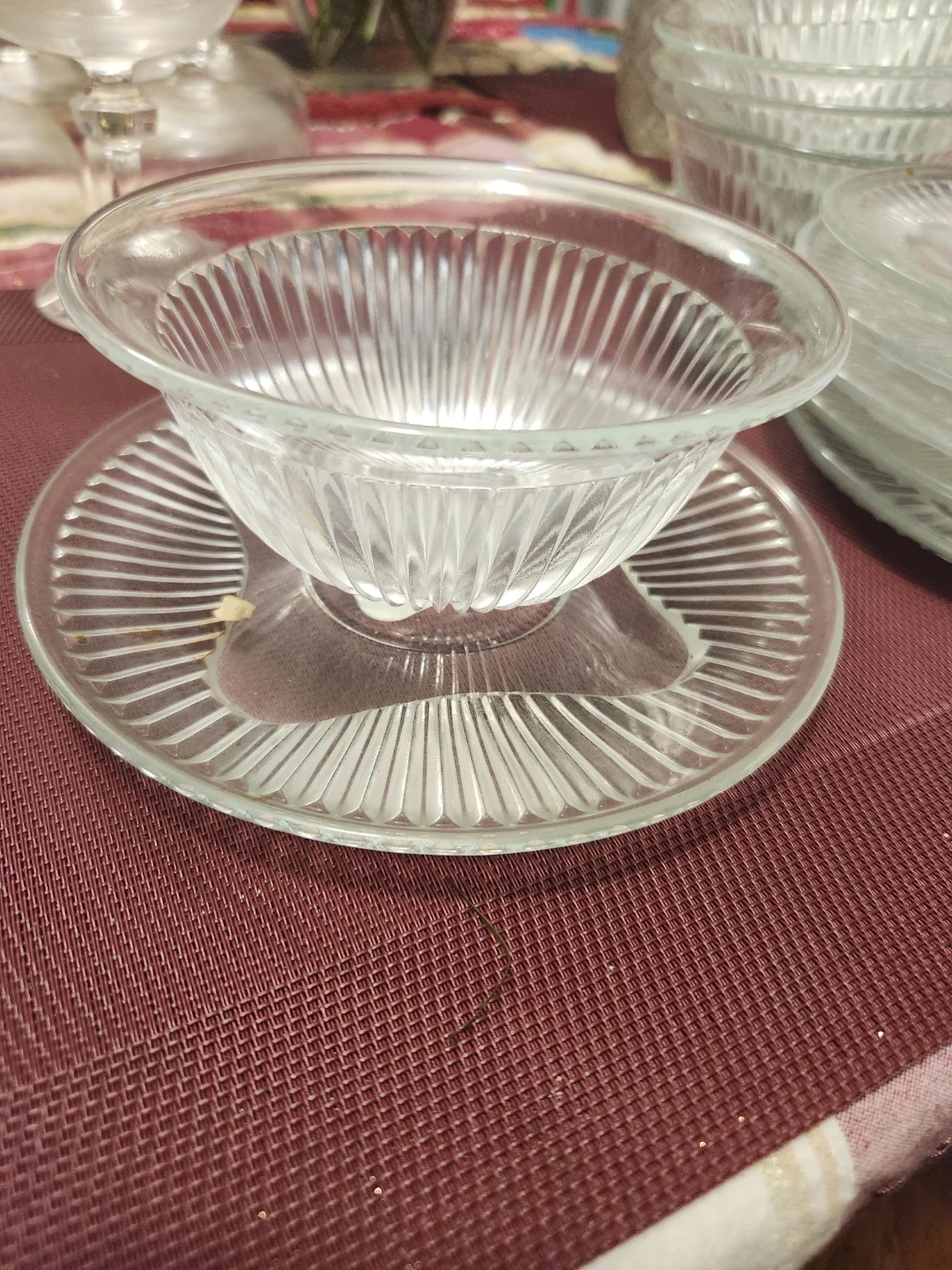 Selling a set of clear glass dessert bowls and plates. 6 of each. Plates are 7 'inch diameter. These have a lovely vintage look with their ribbed design. Perfect for adding a touch of elegance to your dessert service!
