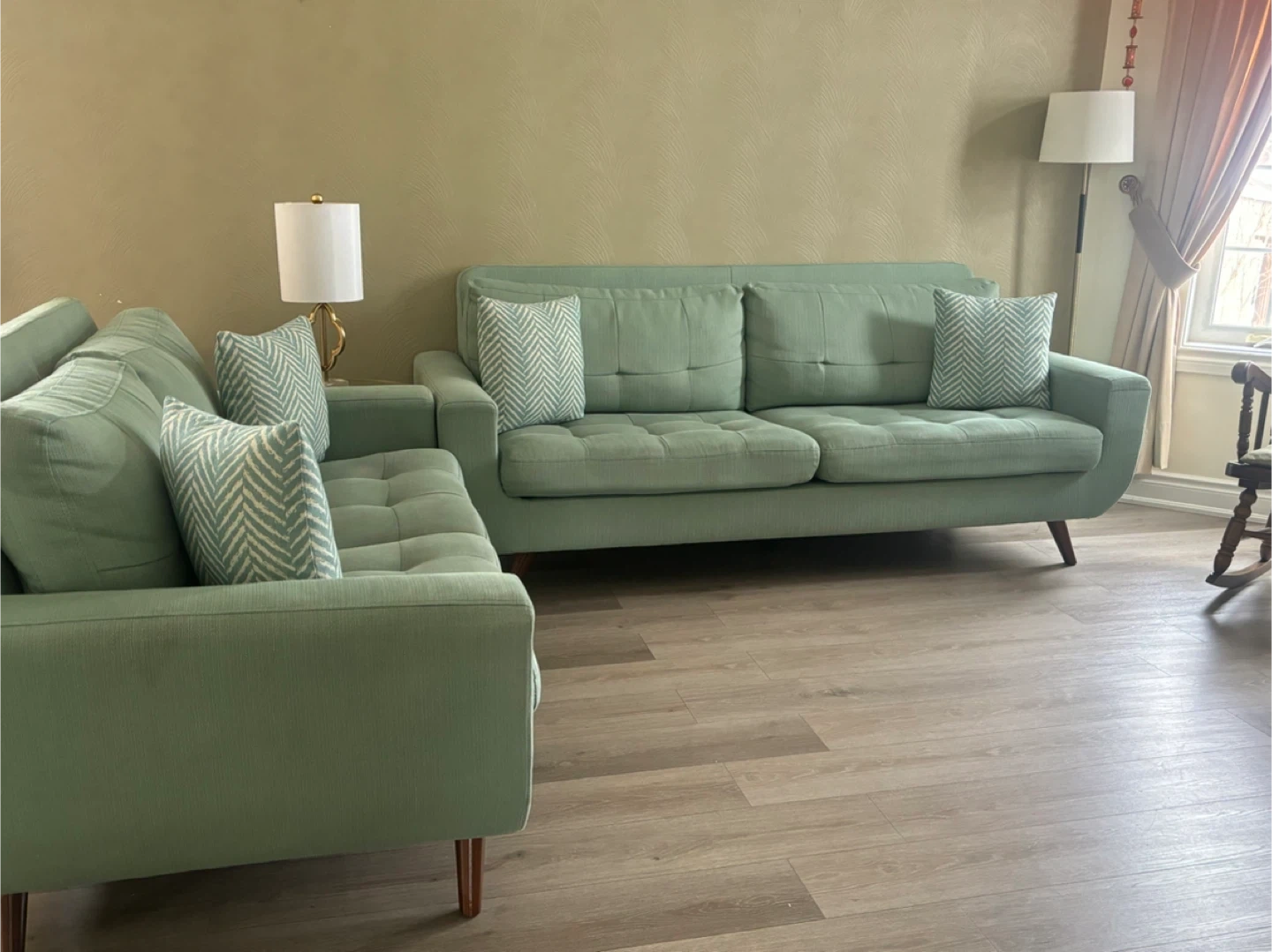 Selling a lovely mint green sofa and loveseat set! It's in great condition and would be a wonderful addition to any living room. The set includes the sofa and a matching loveseat, both with a stylish, modern design. Pillows included!