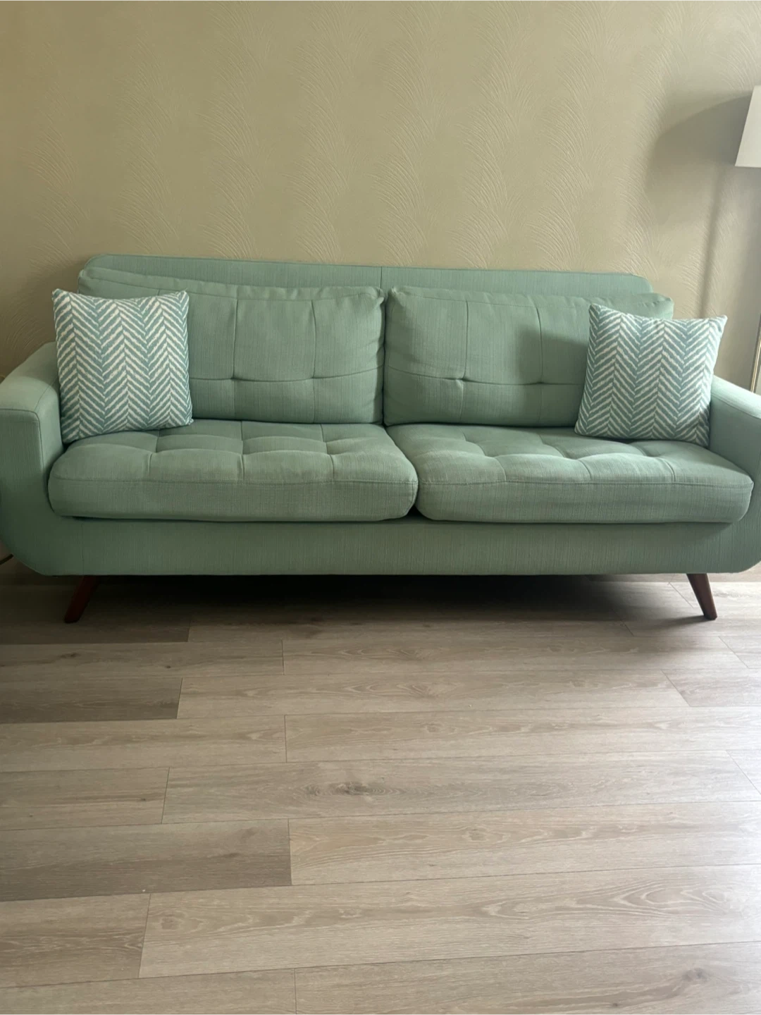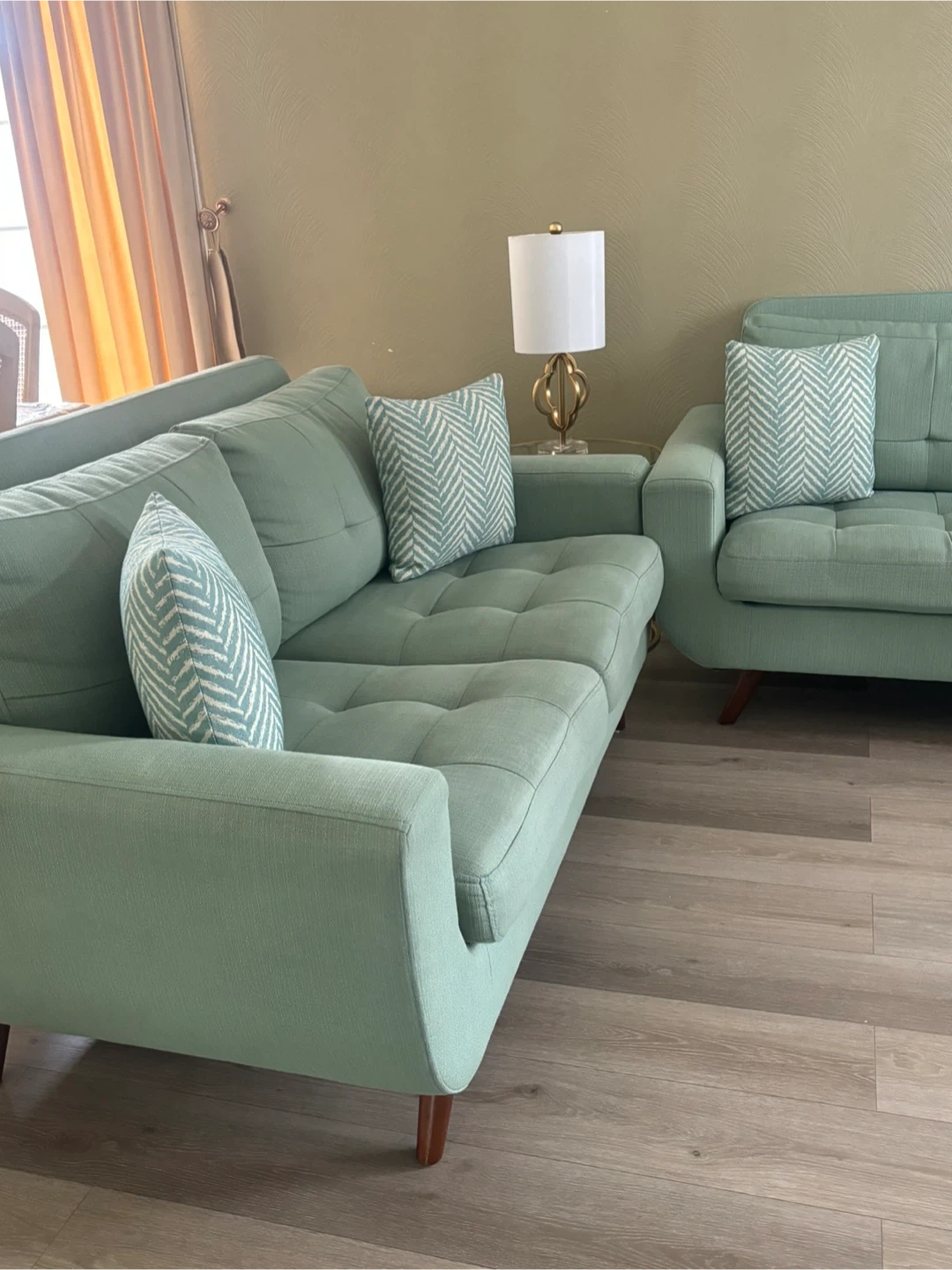 Selling a lovely mint green sofa and loveseat set! It's in great condition and would be a wonderful addition to any living room. The set includes the sofa and a matching loveseat, both with a stylish, modern design. Pillows included!