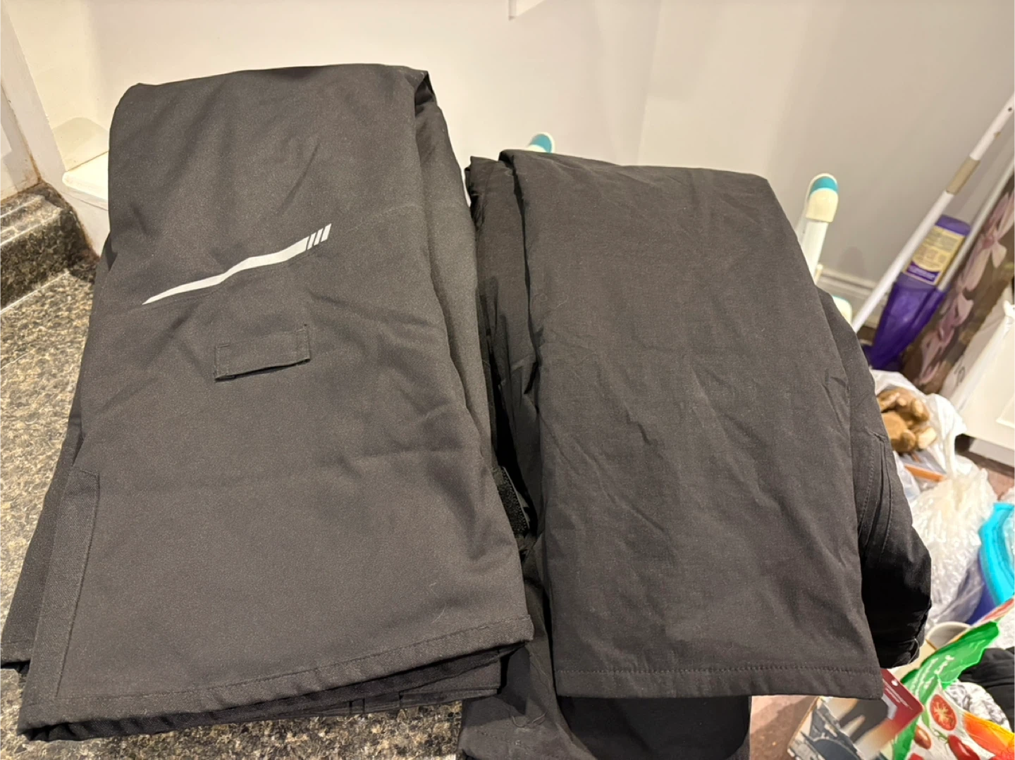 Selling a L and XL snow/wind proof pants. laminated micro fleece lining for water and wind protection. Comfortable and with front pockets.