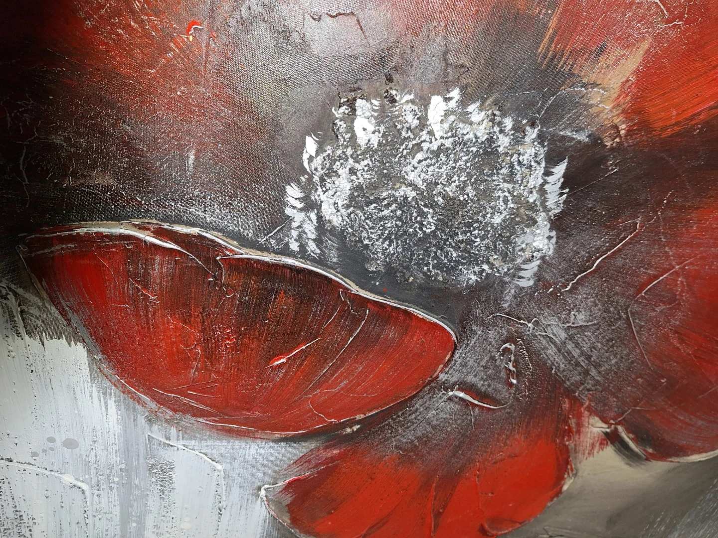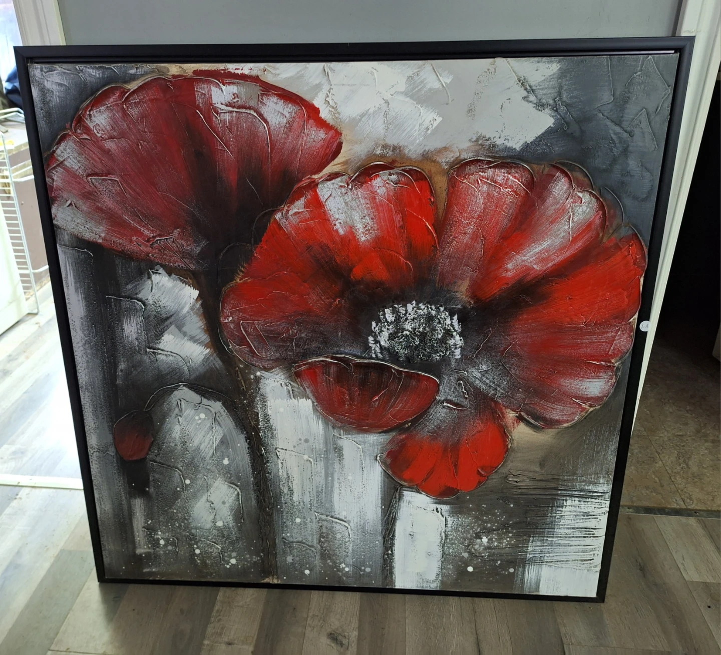 Beautiful red poppy painting with black and grey background on canvas with black frame. The artwork has thick brushstrokes and texture.