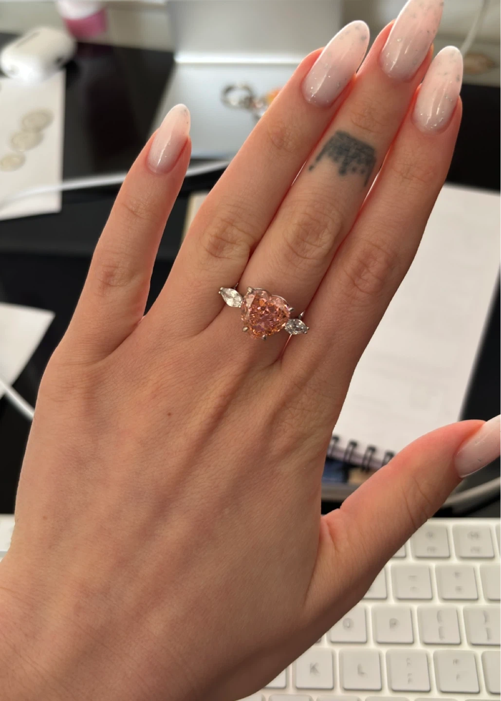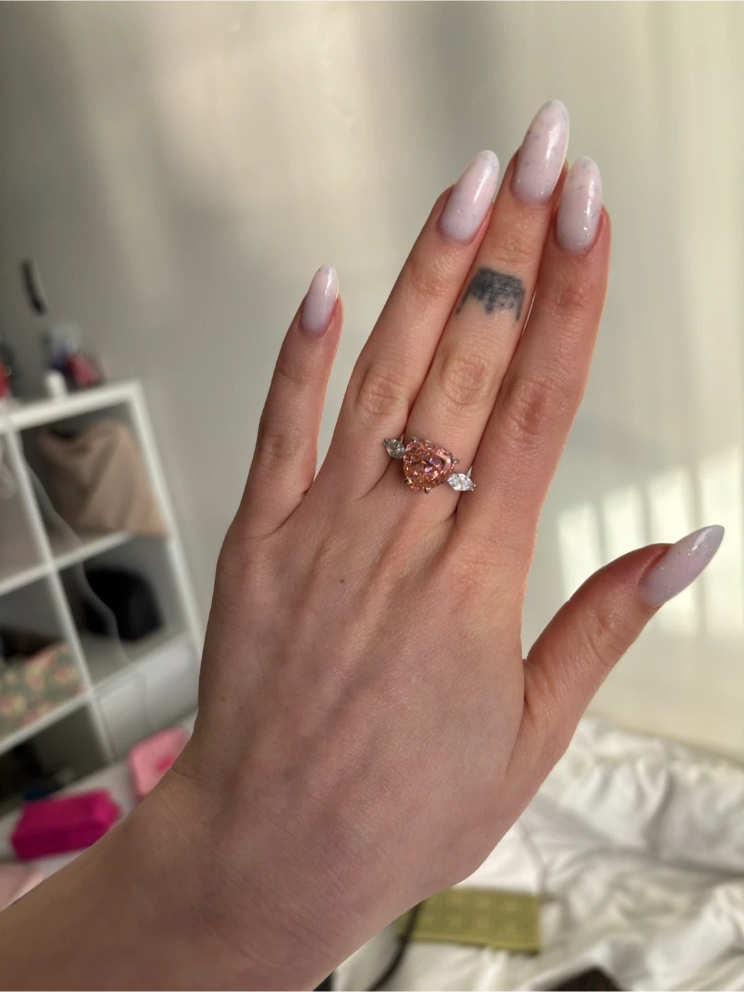Selling a lovely ring featuring a heart-shaped pink gem. It has smaller clear gems on either side. Sterling silver 925, size 7, condition 9.5/10, pick up in New West