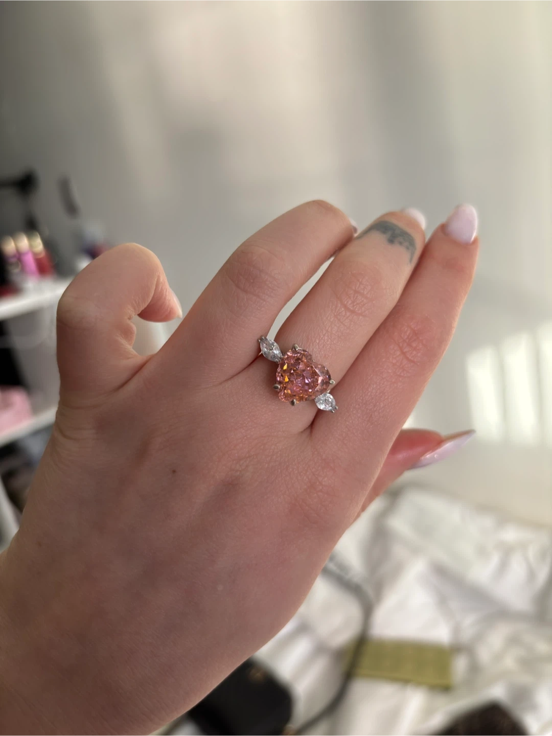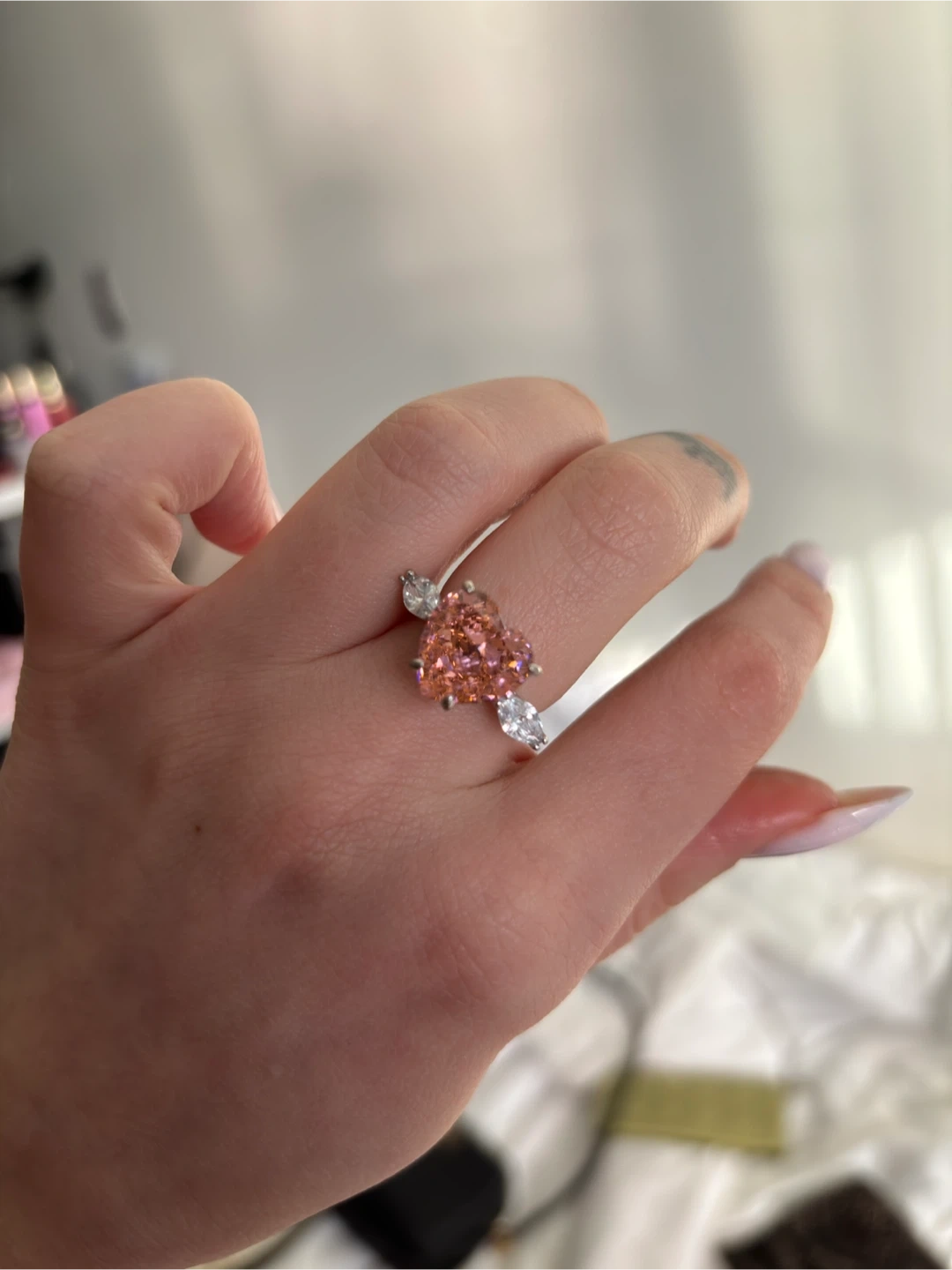 Selling a lovely ring featuring a heart-shaped pink gem. It has smaller clear gems on either side. Sterling silver 925, size 7, condition 9.5/10, pick up in New West