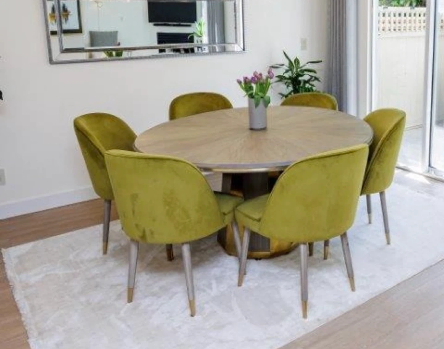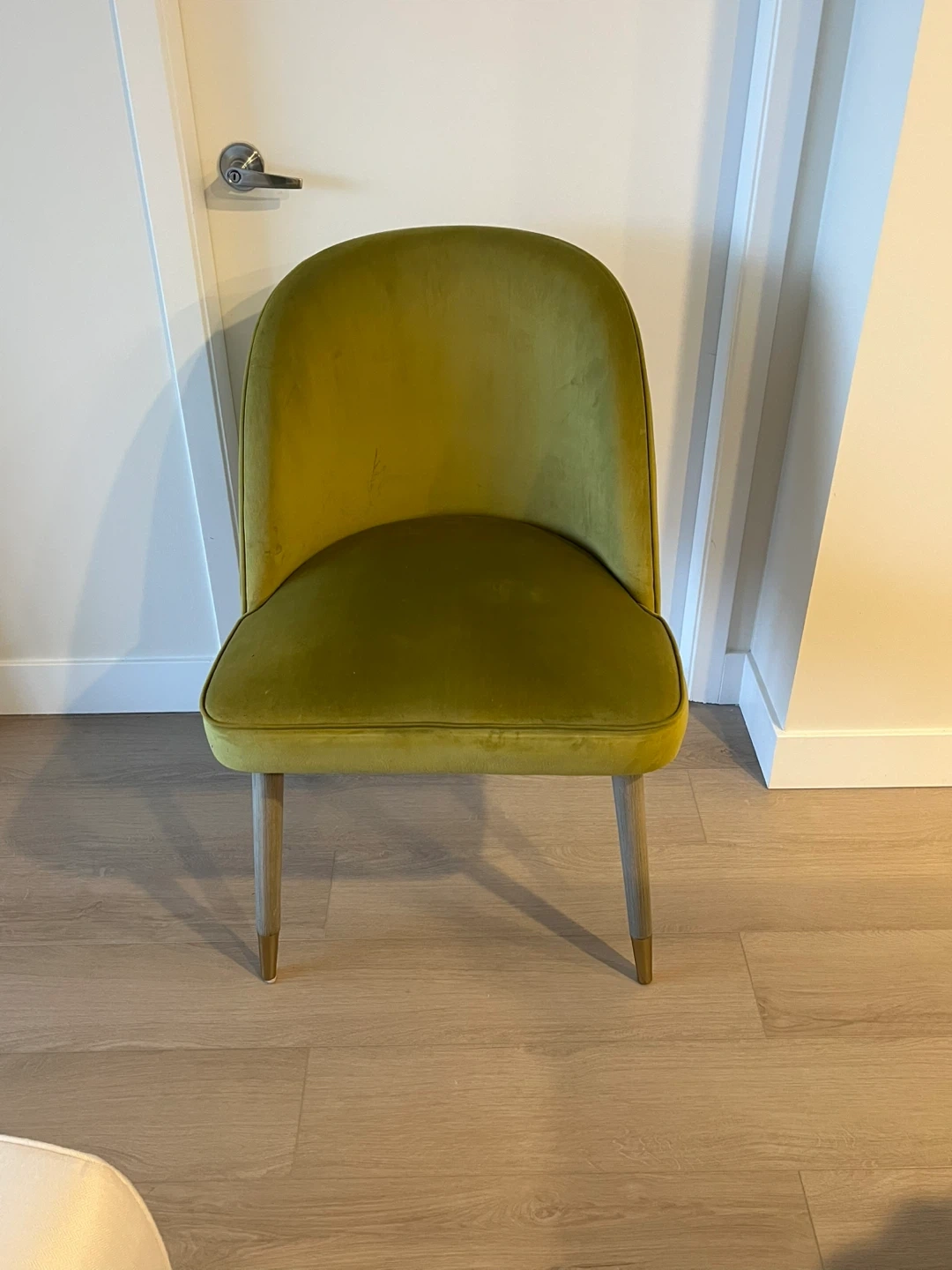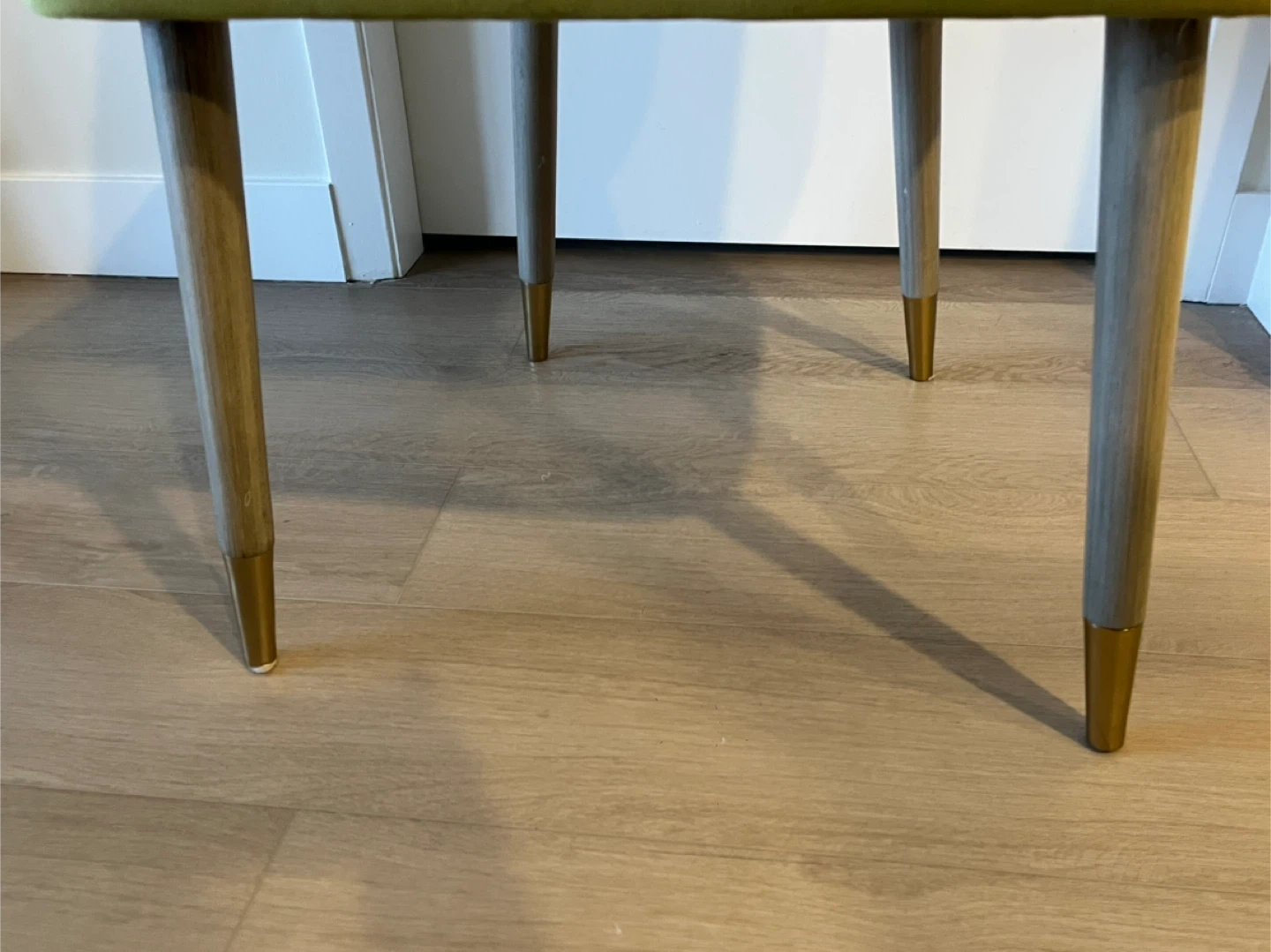 6x custom made chairs for sale. High quality easy care green velvet fabric with grey oak wood & brass gold leg.