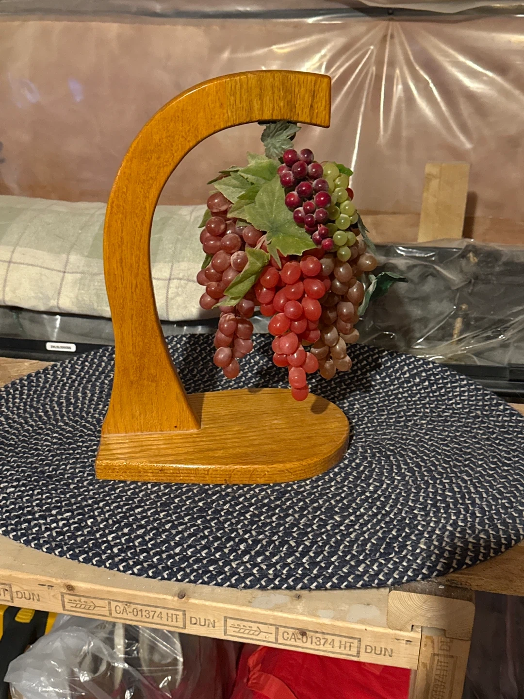 Here's a decorative faux grape cluster with a wooden stand! It's in great condition and would look lovely in any kitchen or dining area
