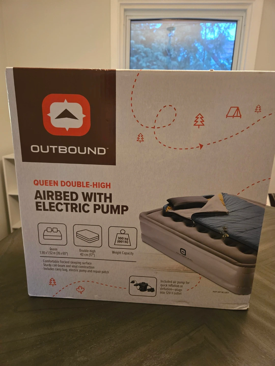 Selling a brand new unopened Outbound Queen Double-High Airbed with Electric Pump.