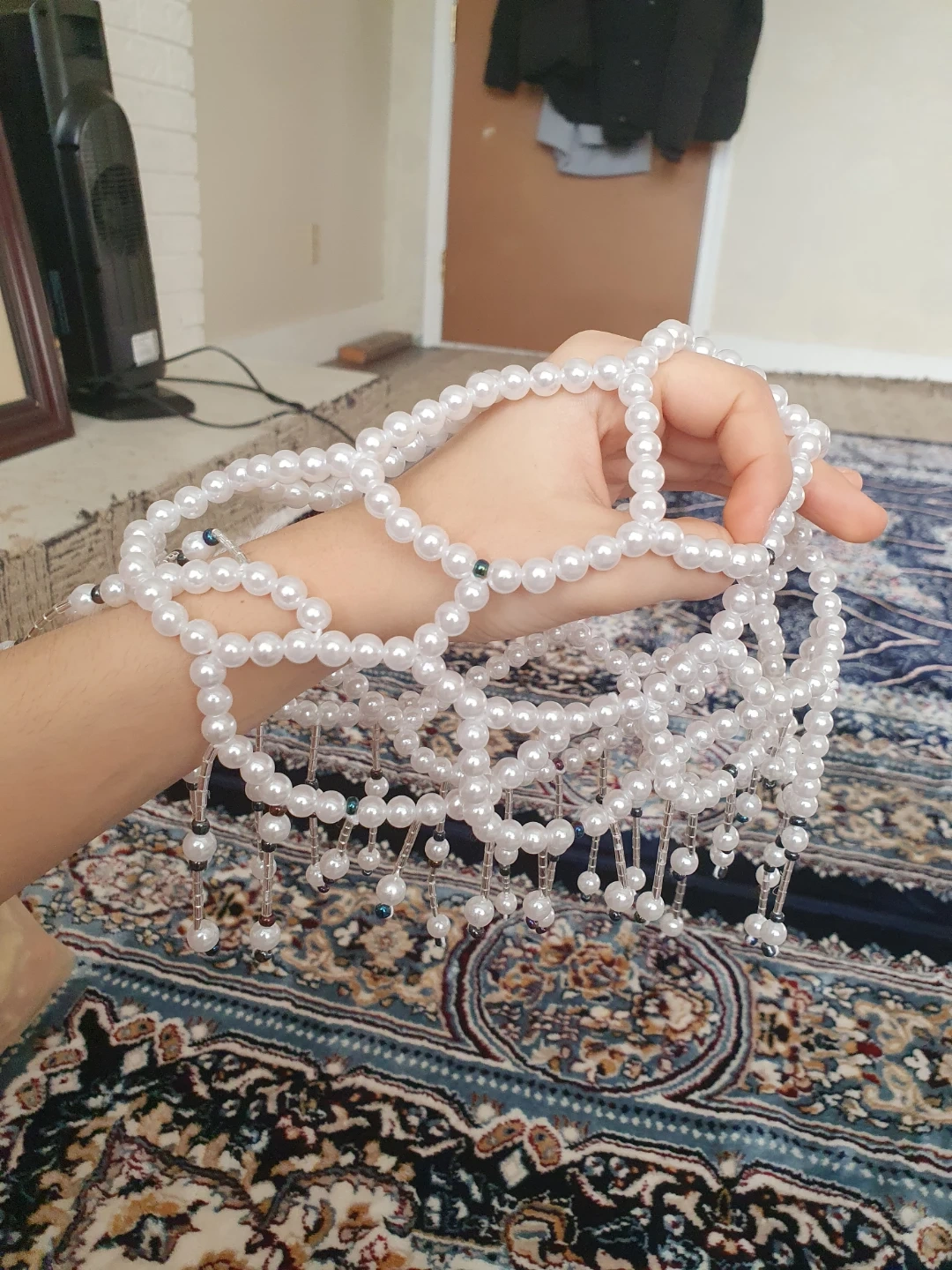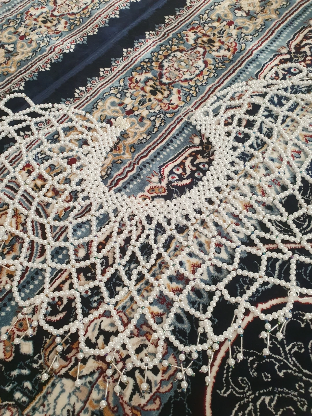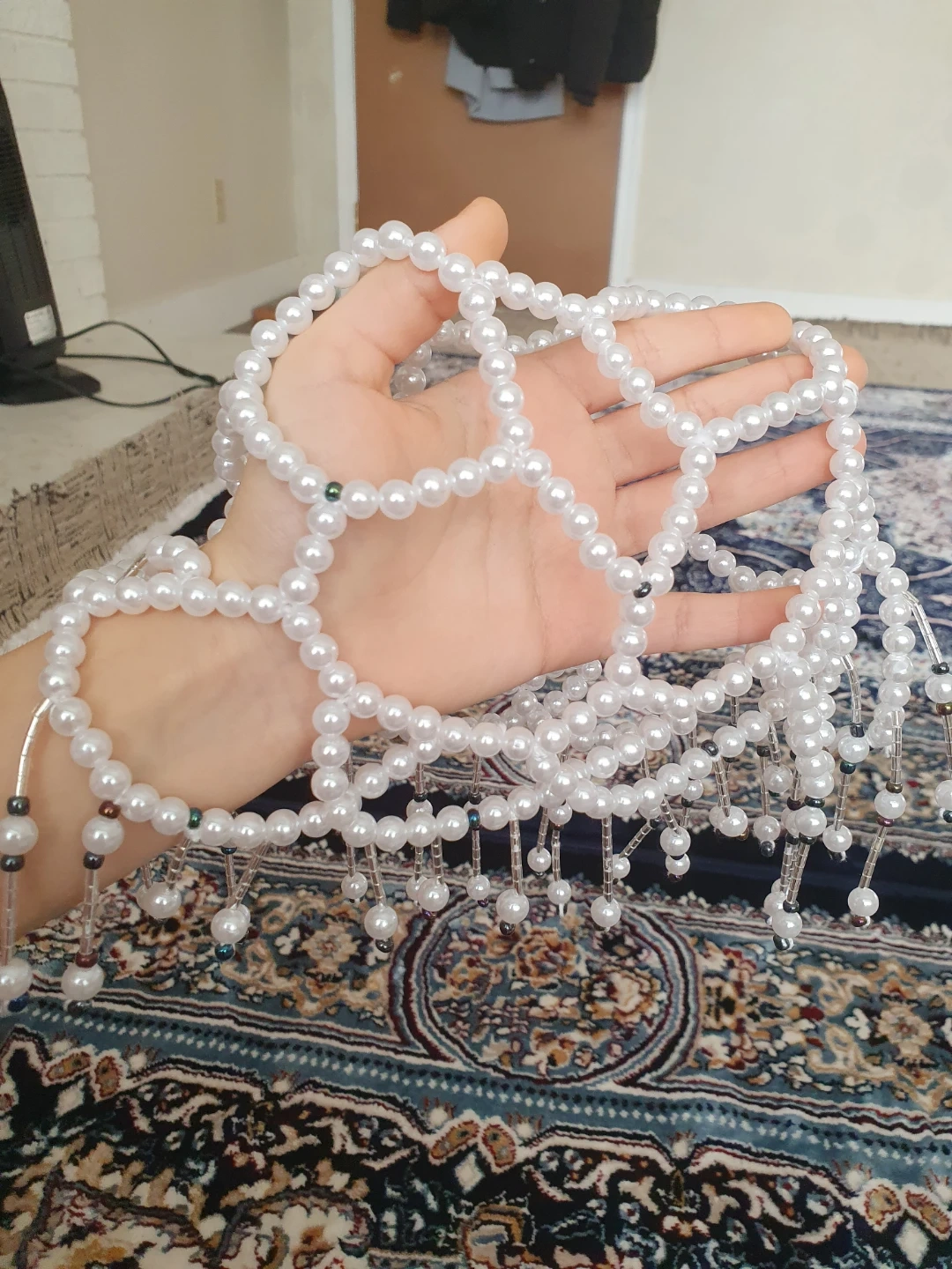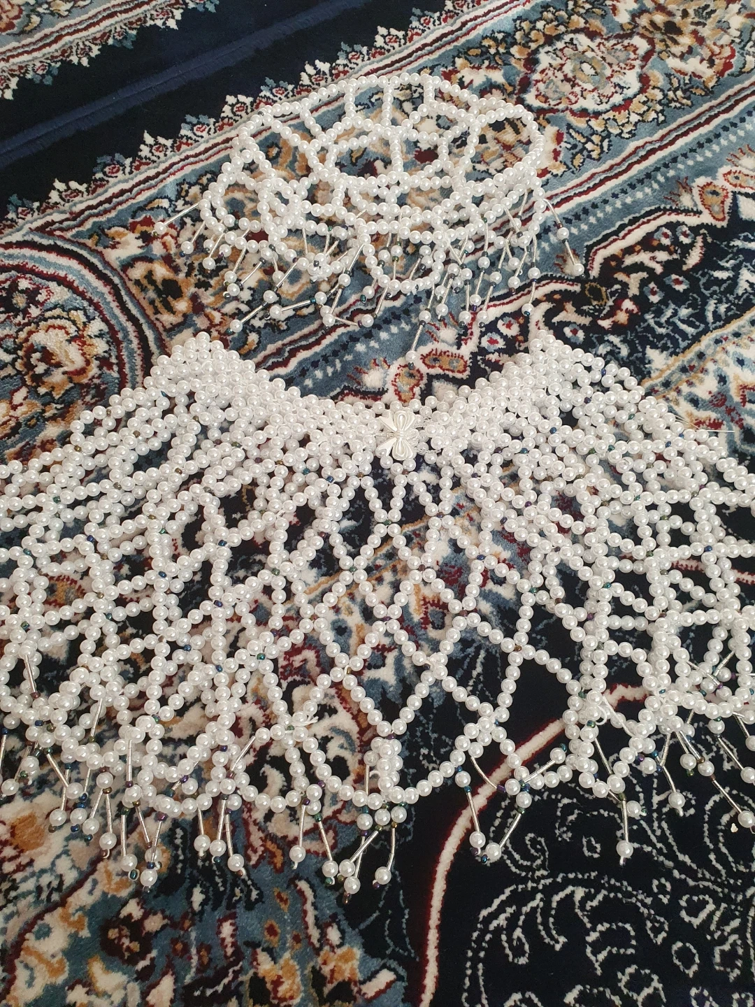 Here's a beaded collar necklace! It's white and would be a great addition to any outfit handmade knew with a pearls hat and is a handmade