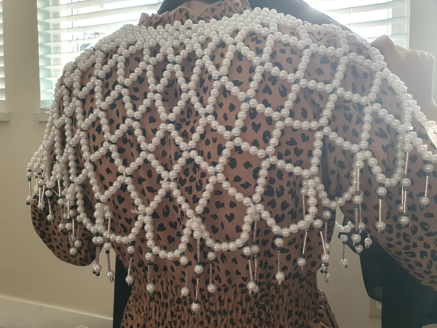 Here's a beaded collar necklace! It's white and would be a great addition to any outfit handmade knew with a pearls hat and is a handmade