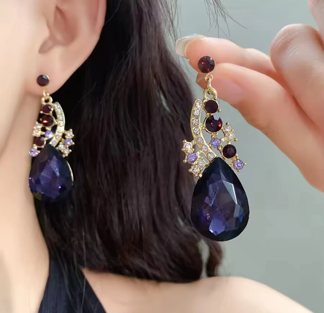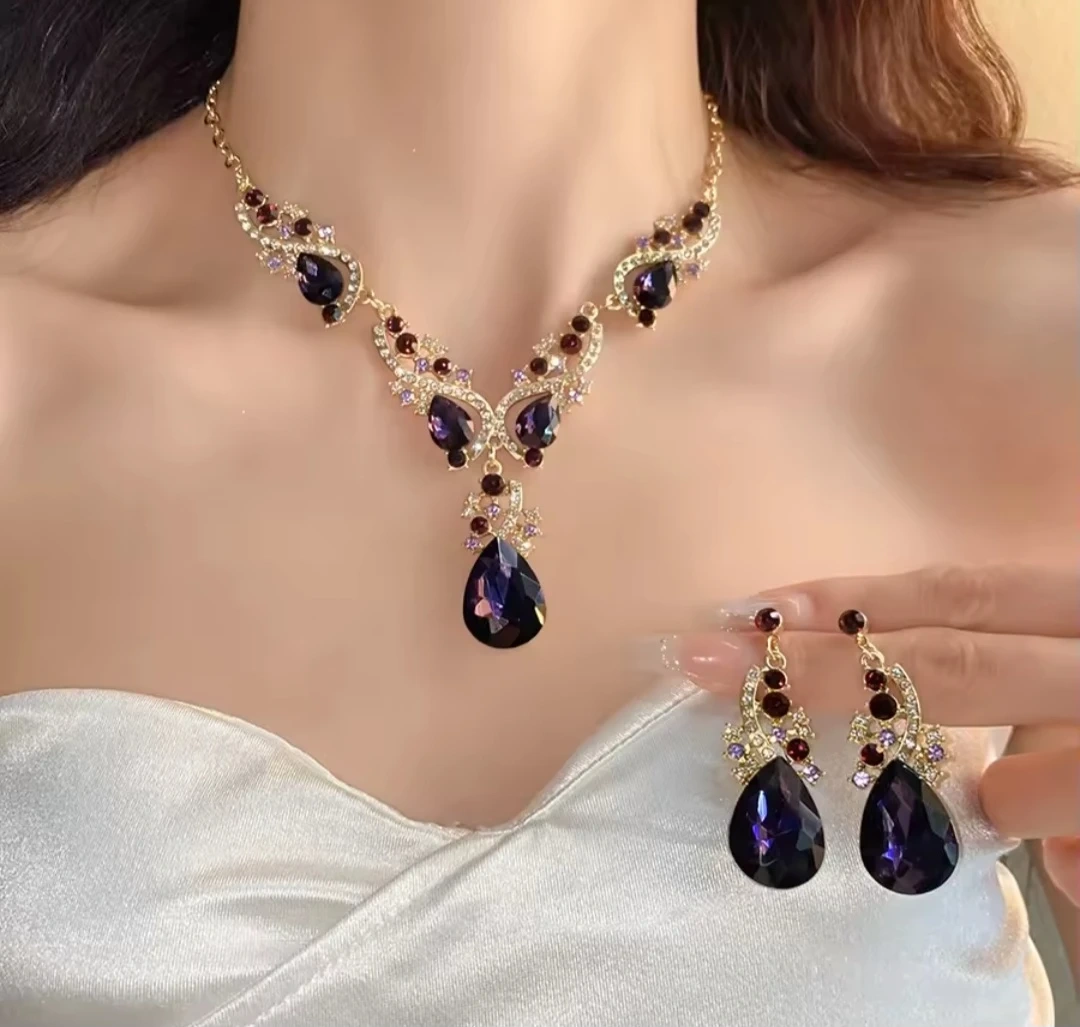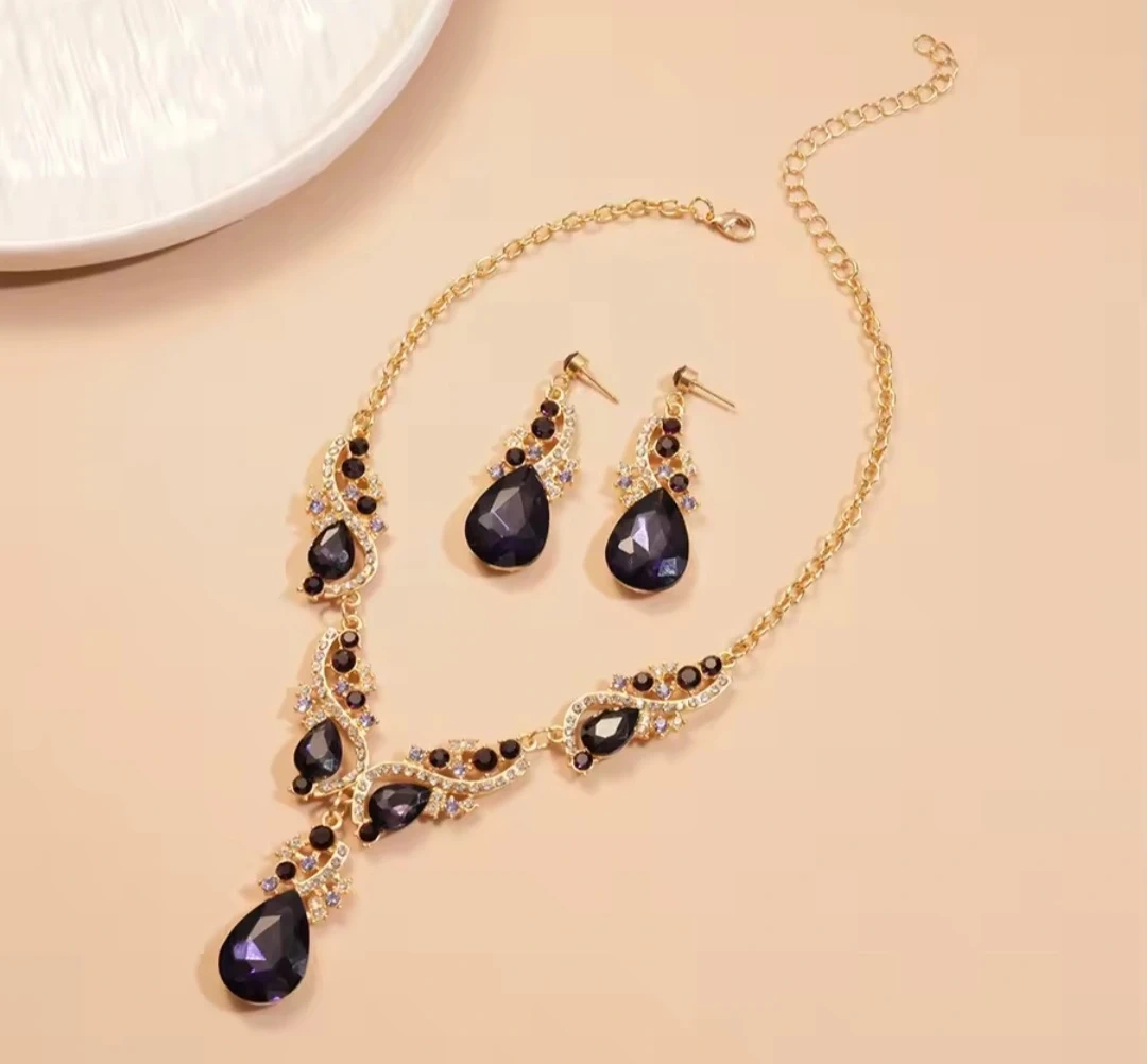 Beautiful gold-tone necklace and earring set featuring purple gemstones. This set is perfect for adding a touch of elegance to any outfit!