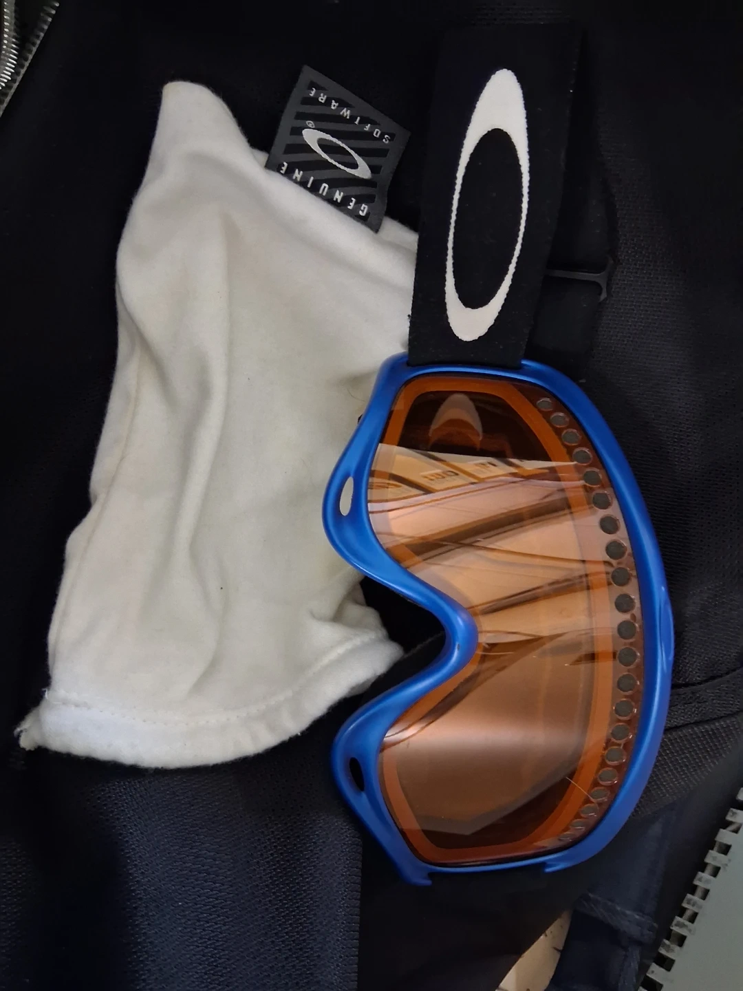 Selling a pair of vintage a fram Oakley goggles with a blue frame. They come with a soft, genuine Oakley software cloth for cleaning and storage. Perfect for hitting the slopes this winter!