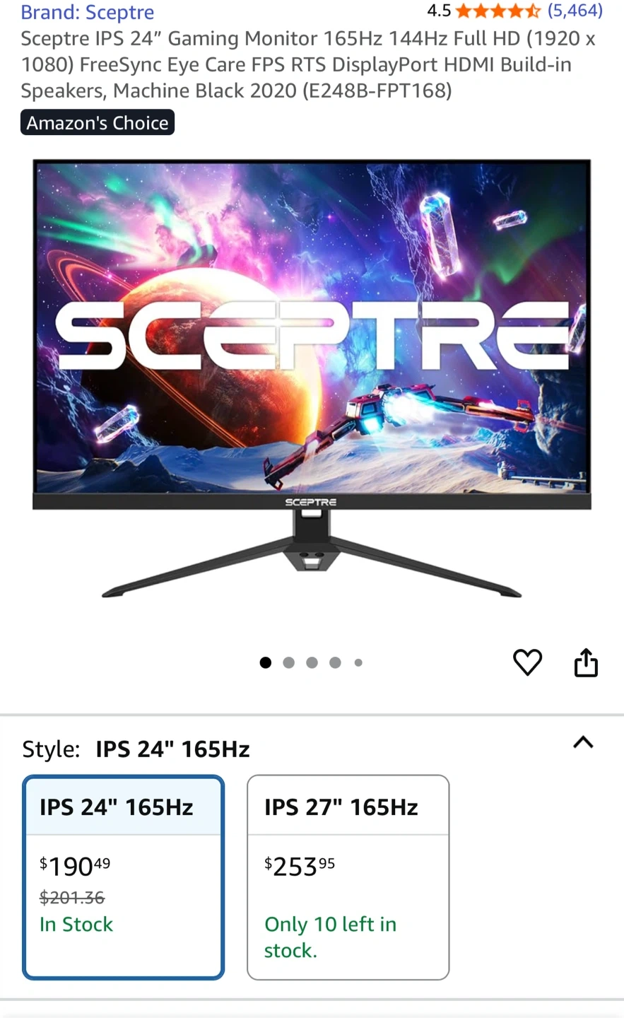 Selling a brand new in box Sceptre IPS 24" gaming monitor! It boasts a 165Hz refresh rate and Full HD (1920 x 1080) resolution for smooth gameplay and clear visuals. Features include FreeSync eye care, FPS, and RTS display modes. It also has DisplayPort and HDMI inputs, and built-in speakers. Comes with the original box! Brand new