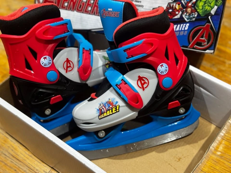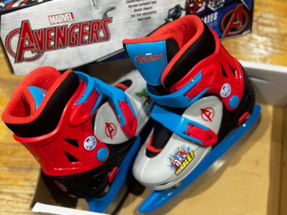 The Marvel Avengers skates are perfect for children with growing feet. The durable moulded plastic boot features tool-free push-button adjustability in 4 sizes from Y8 to Y11. High-definition character graphics and a padded liner keep tiny feet comfy and warm, while still looking super-hero stylish. Double ratcheting buckles on the skates allow for an exact fit, and the steel blade ensures stability. Skate size Y12-J2, footwear shoe size Y12-2.