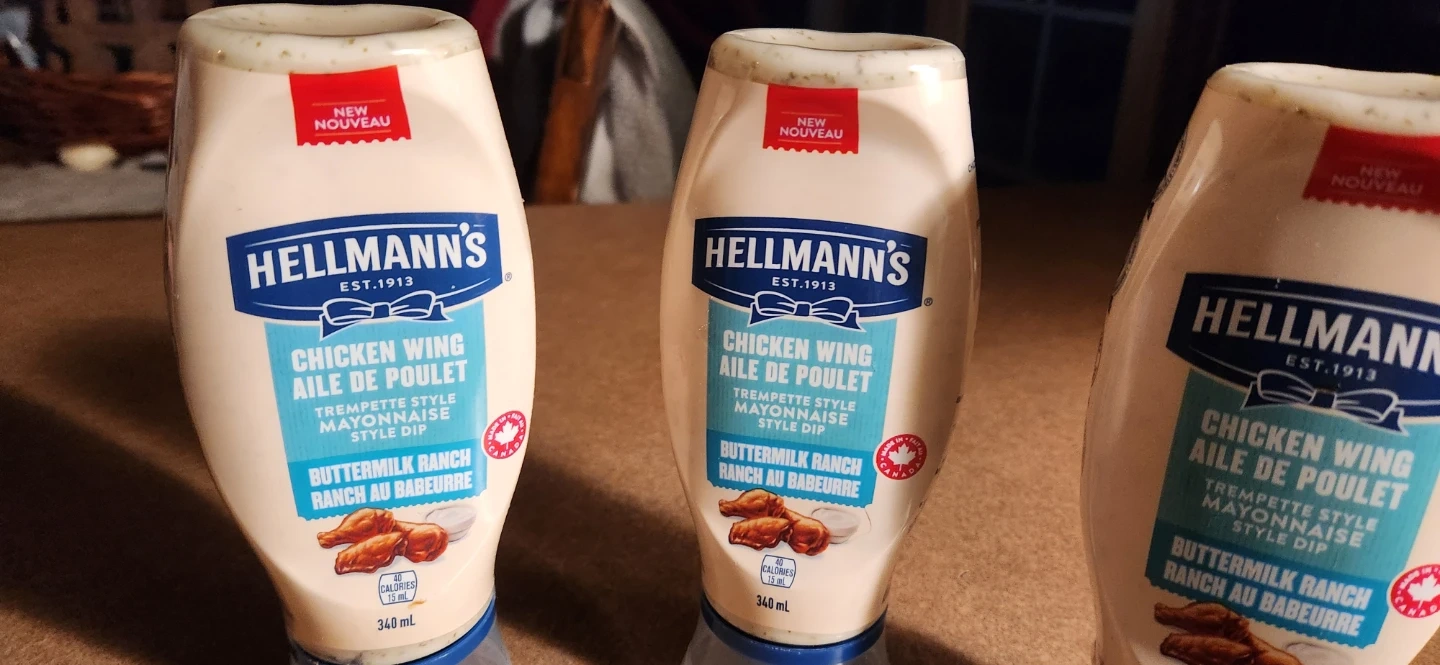 Selling a bottle of Hellmann's Chicken Wing Buttermilk Ranch dip. It's a 340 mL bottle, perfect for your next snack or meal! It's a tasty mayonnaise-style dip that goes great with chicken wings or anything else you'd like to add a little flavour to