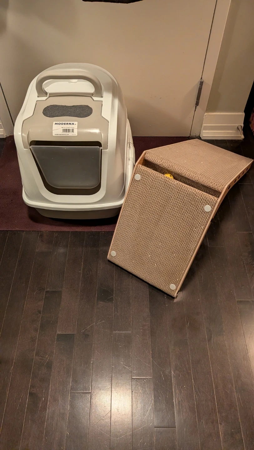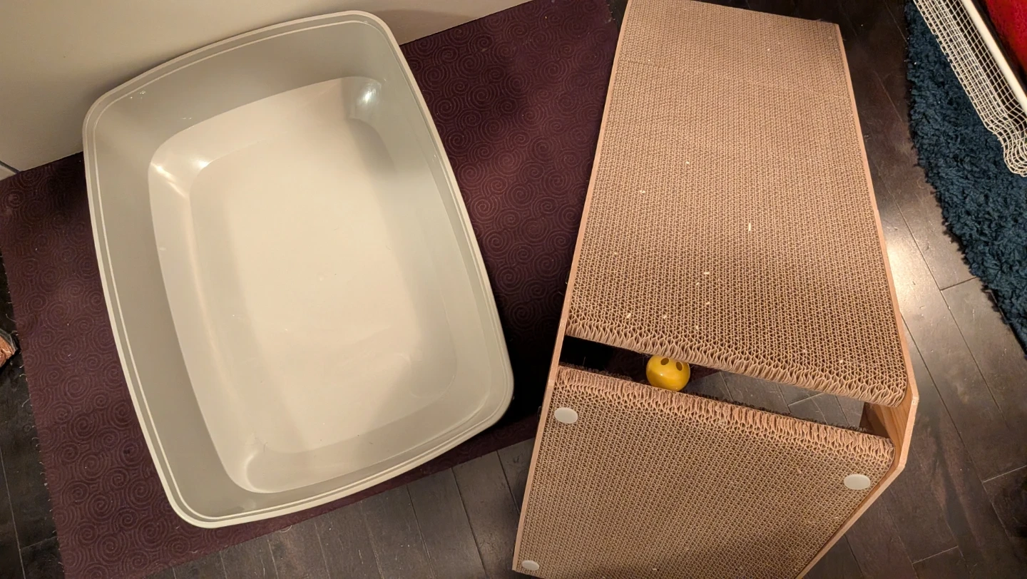 Selling a cat litter box and a cat scratcher. Both are in great condition and ready for a new feline friend!