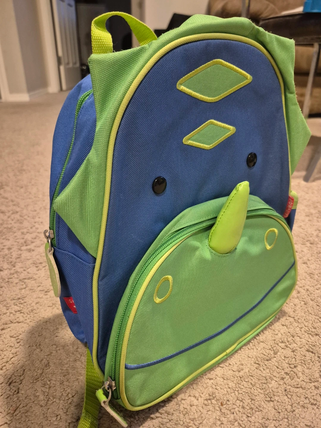 Here's a cute Skip Hop Zoo dinosaur backpack! It's in great condition and perfect for your little one. The backpack features a fun dinosaur design with vibrant blue and green colours. It's the perfect size for toddlers and preschoolers to carry their essentials.