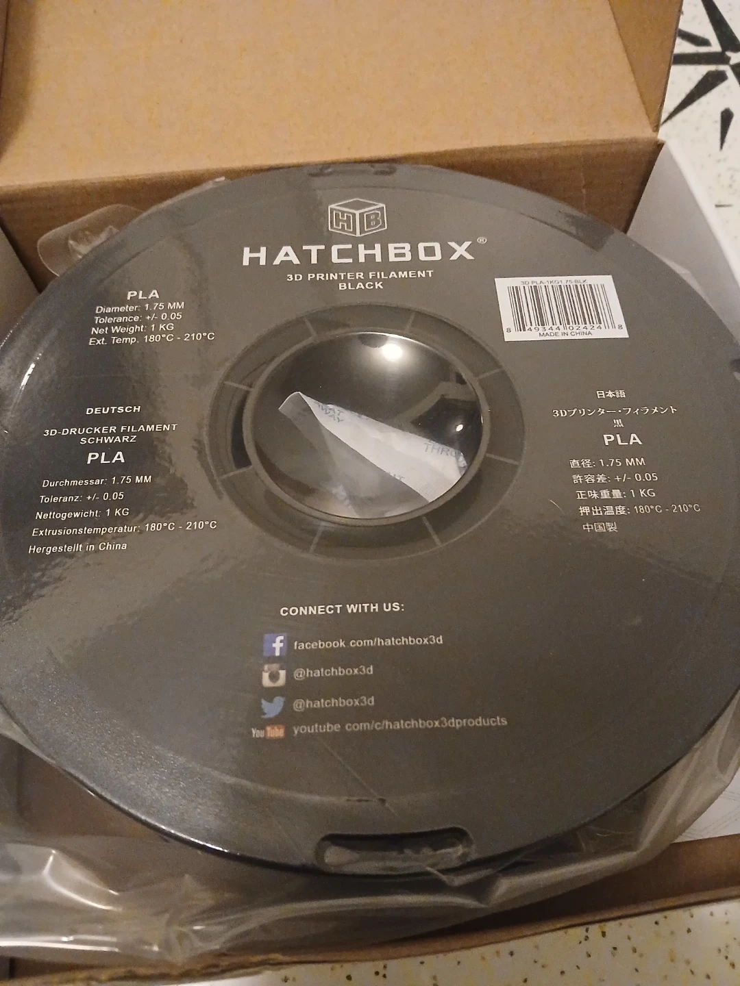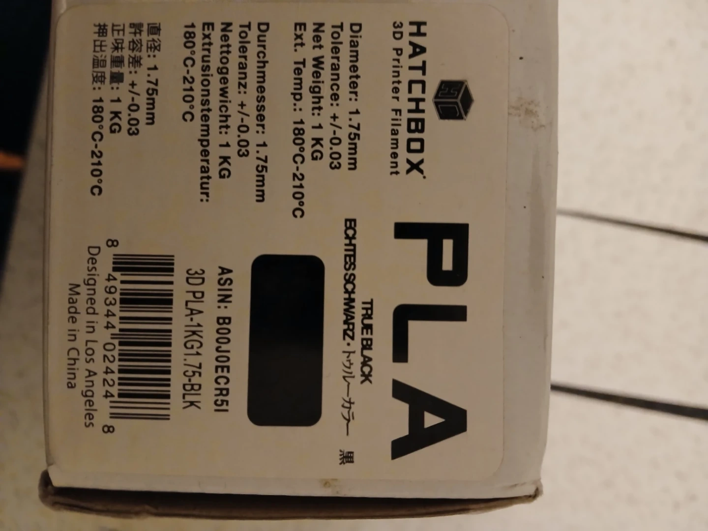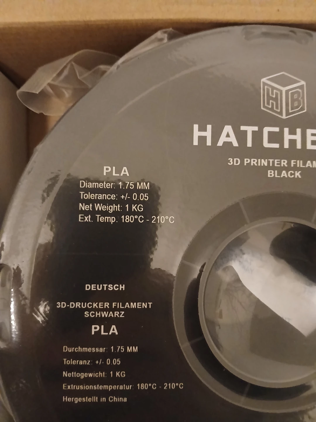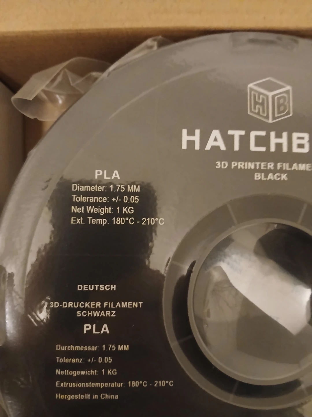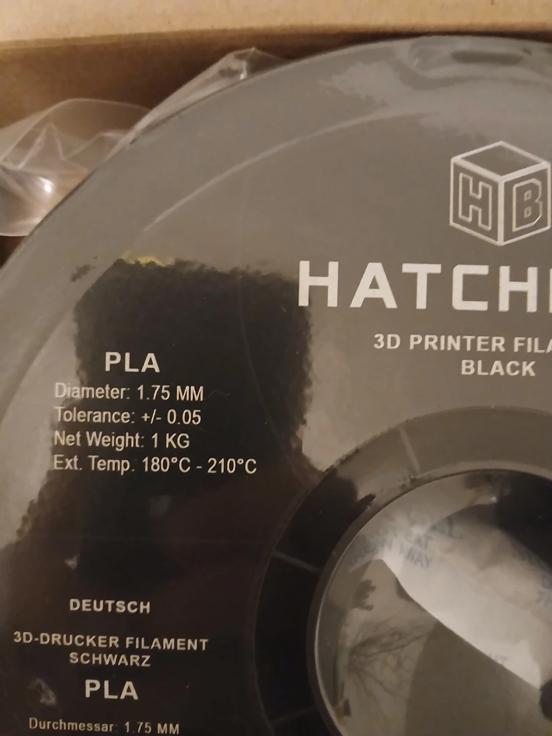 Selling a spool of Hatchbox PLA 3D printer filament in True Black. It's 1.75mm filament and 1 kg per spool. Extrusion temperature is 180°C - 210°C.