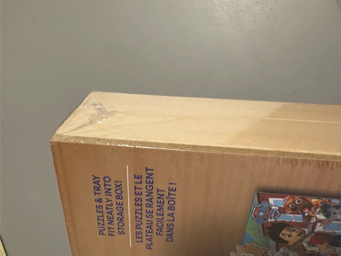 Selling a brand new Paw Patrol 5 wood puzzles set! It's still in the original packaging and ready for a new home. Perfect for kids aged 4 and up. Each puzzle features your favourite Paw Patrol characters. The set includes a tray for easy storage too. A handmade name tag, your choice of color is included.