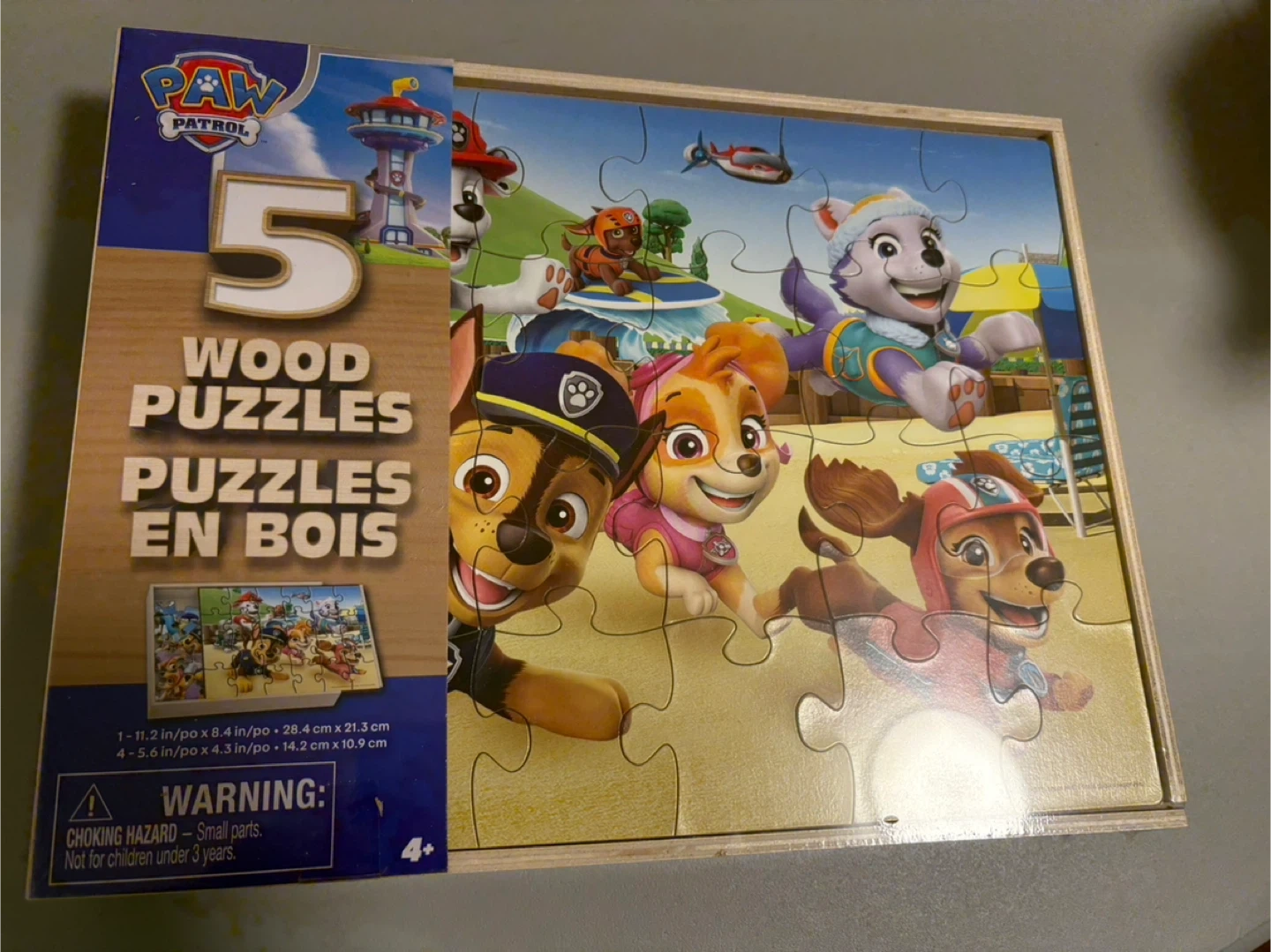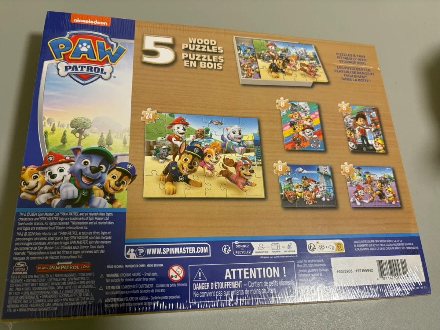 Selling a brand new Paw Patrol 5 wood puzzles set! It's still in the original packaging and ready for a new home. Perfect for kids aged 4 and up. Each puzzle features your favourite Paw Patrol characters. The set includes a tray for easy storage too. A handmade name tag, your choice of color is included.