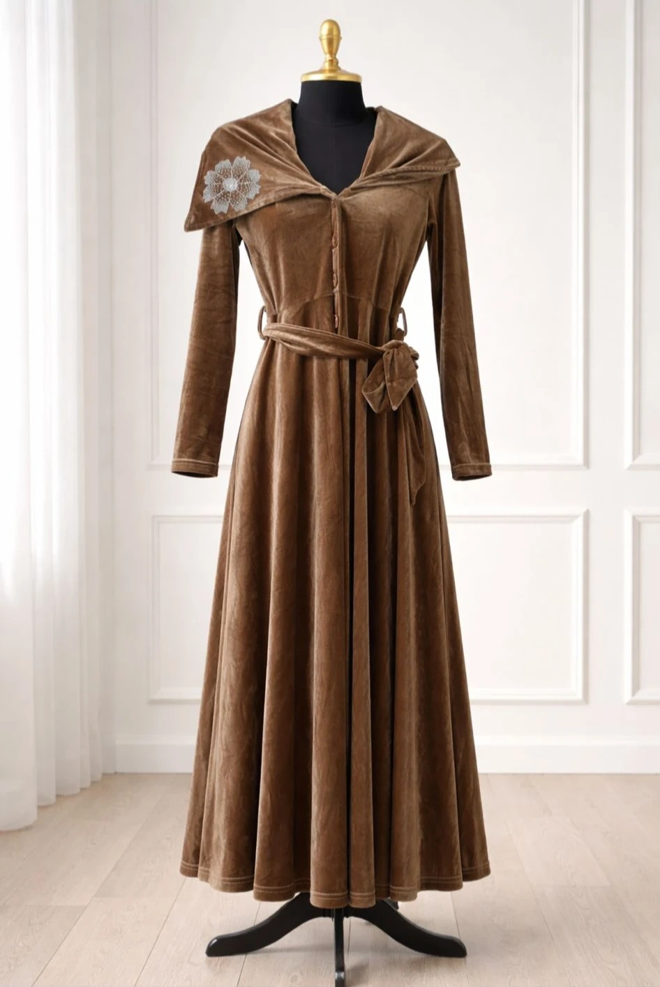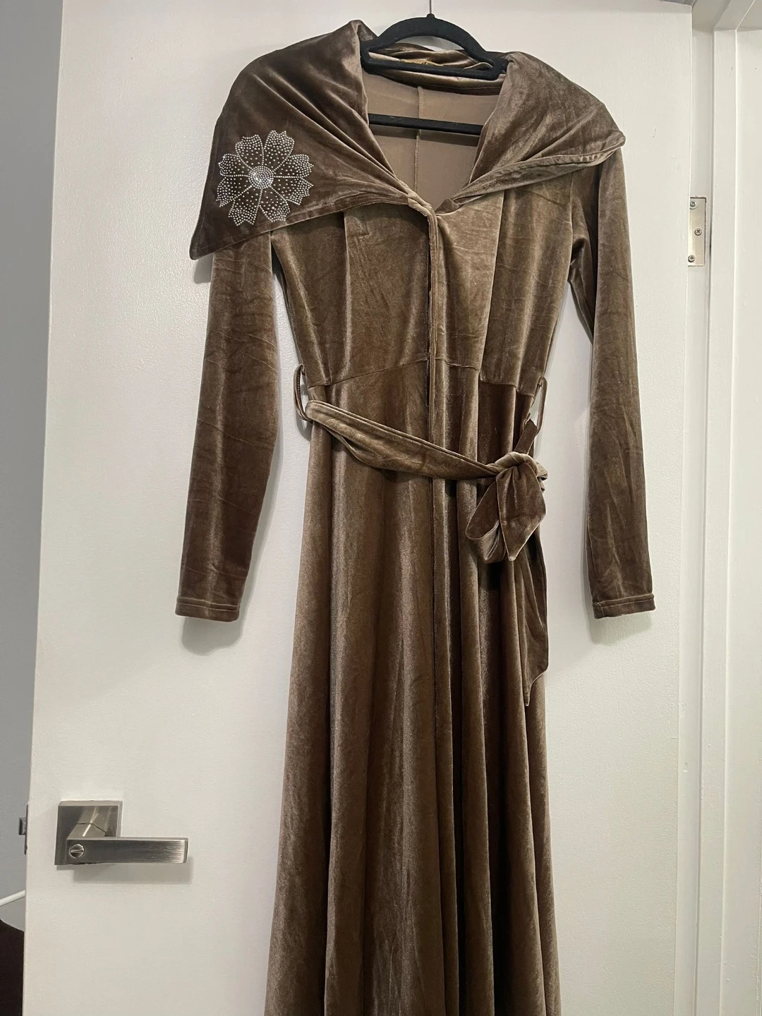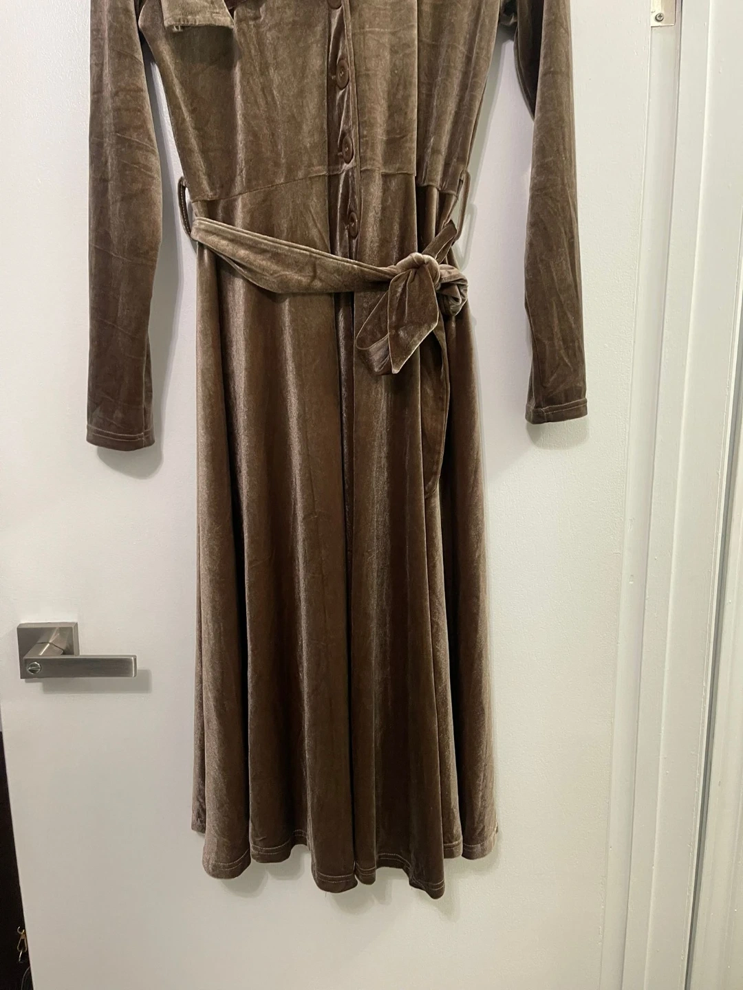 Elegant velvet dress from Easier in a beautiful beige-brown neutral tone that’s easy to dress up or down. The soft velvet fabric gives it a rich, classy look while remaining comfortable to wear. Above-the-ankle length, making it flattering and perfect for evening events, dinners, or special occasions. Size is Medium can also fit large as the fabric is slightly stretchy but fits beautifully.