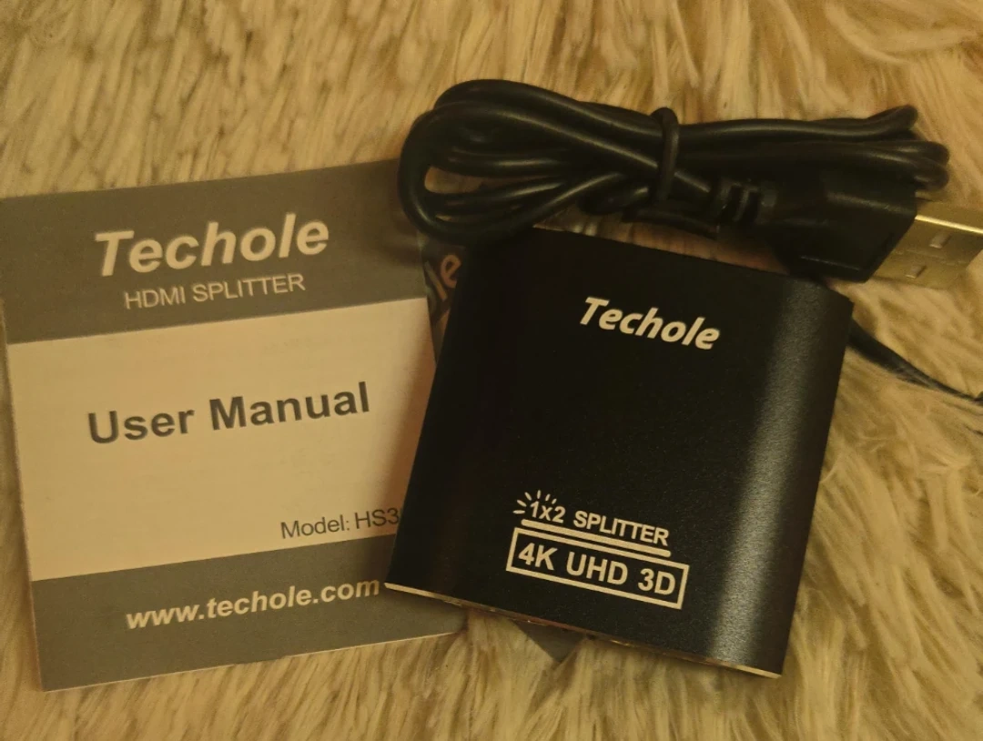 Selling a Techole HDMI Splitter. It supports 4K UHD 3D and is a 1x2 splitter. It comes with the user manual and the original cable