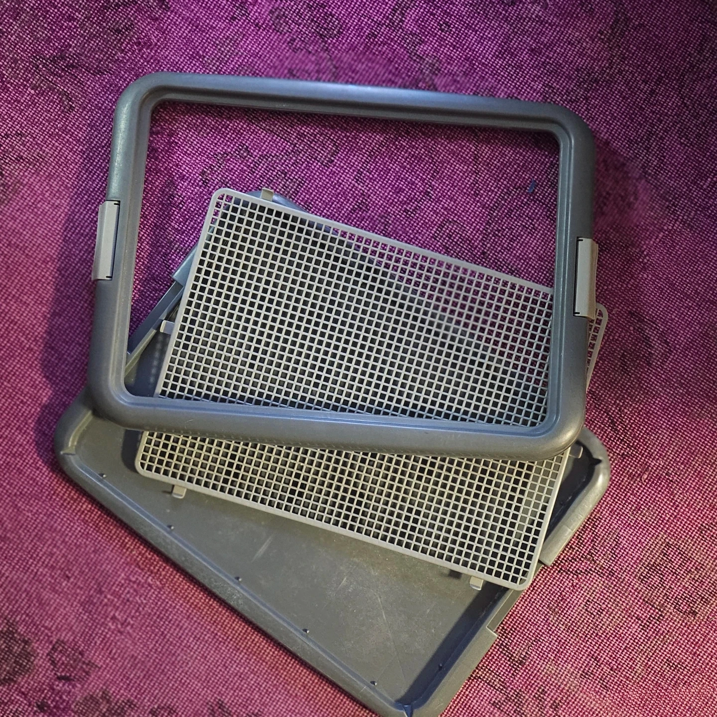 Selling a dog potty training pad. It's in great condition and perfect for training your furry friend! It includes a frame, grid, and base.