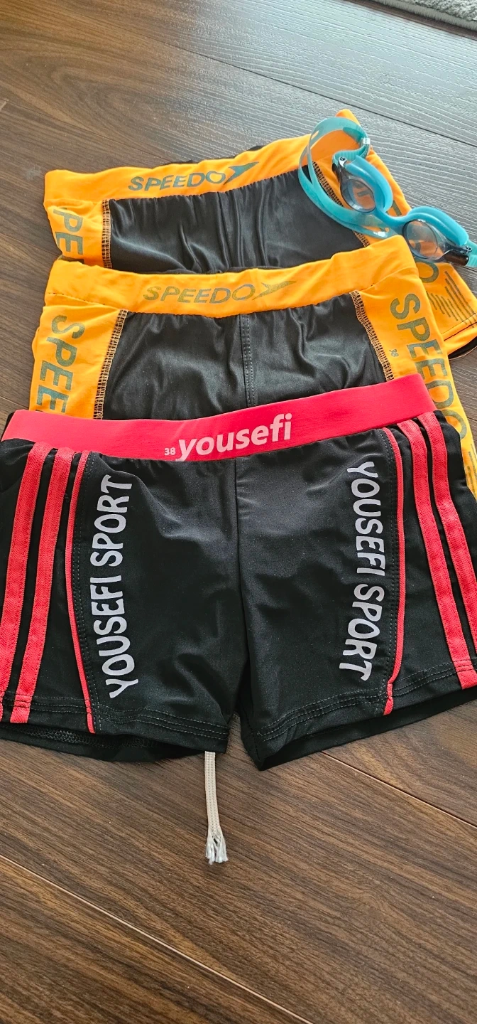 Giving away a bundle of swim trunks and a tie. The swim trunks are black and orange and the tie is blue with light blue stripes. Great for swimming or a special occasion for 6-8 years boy