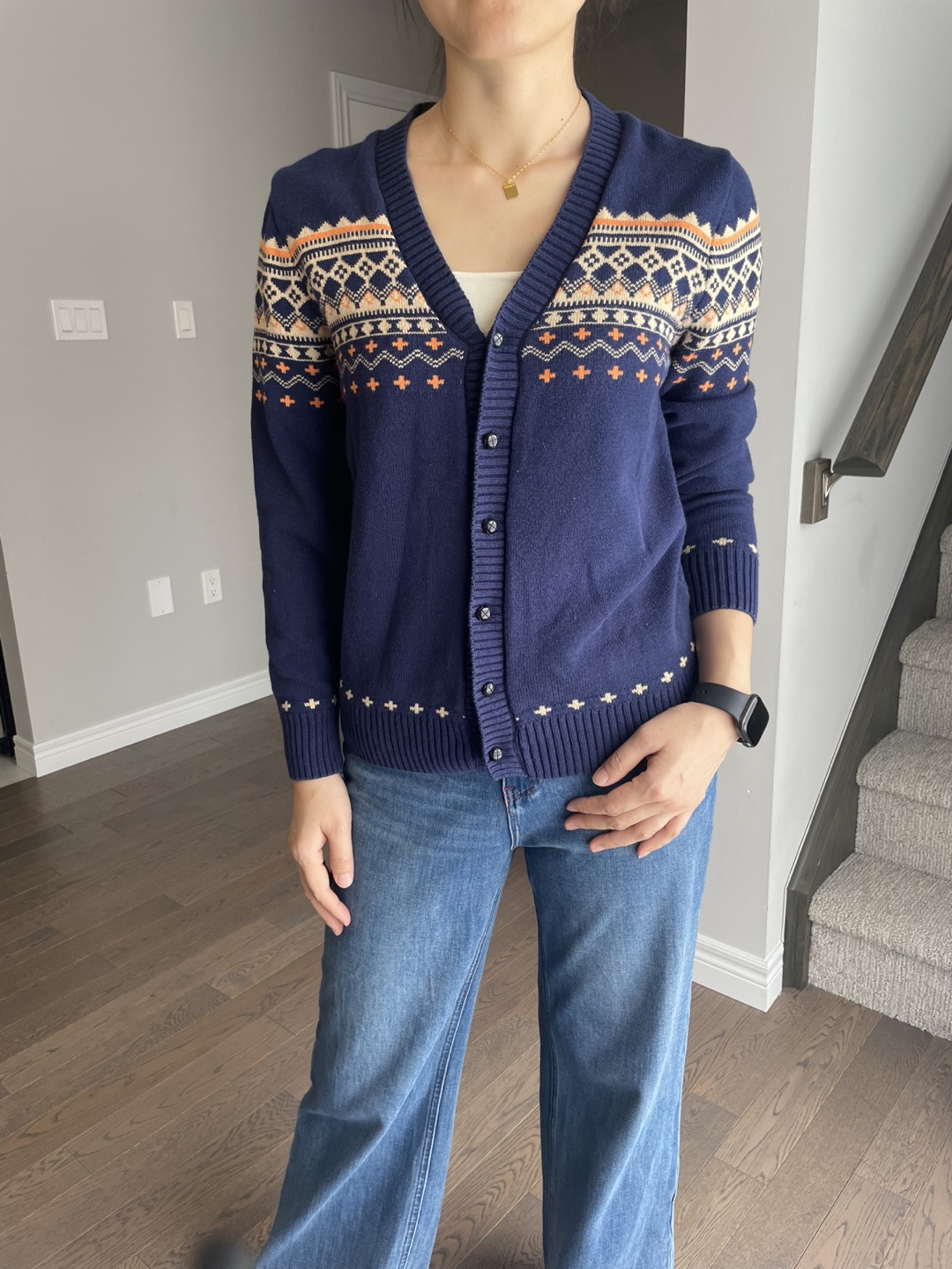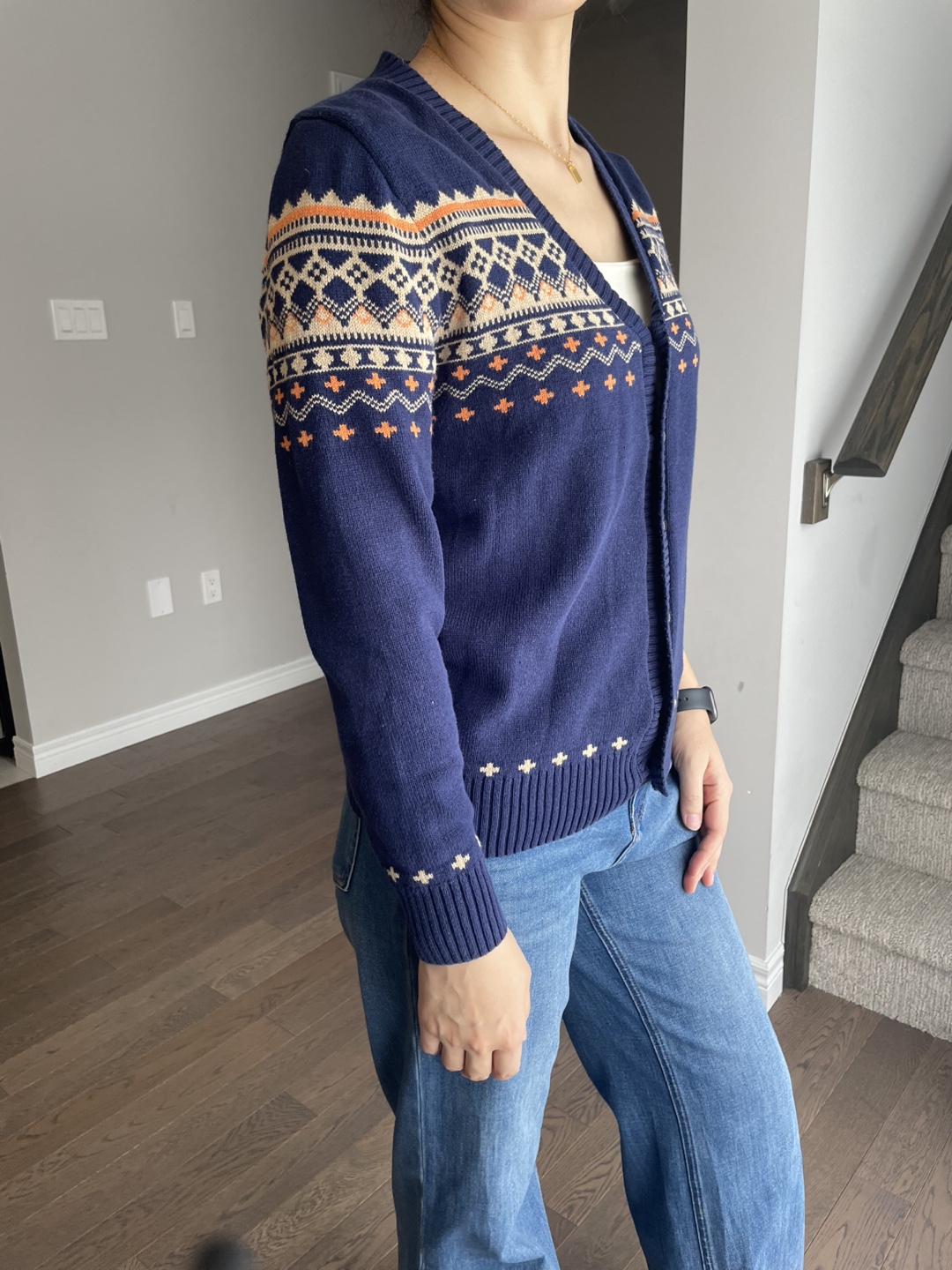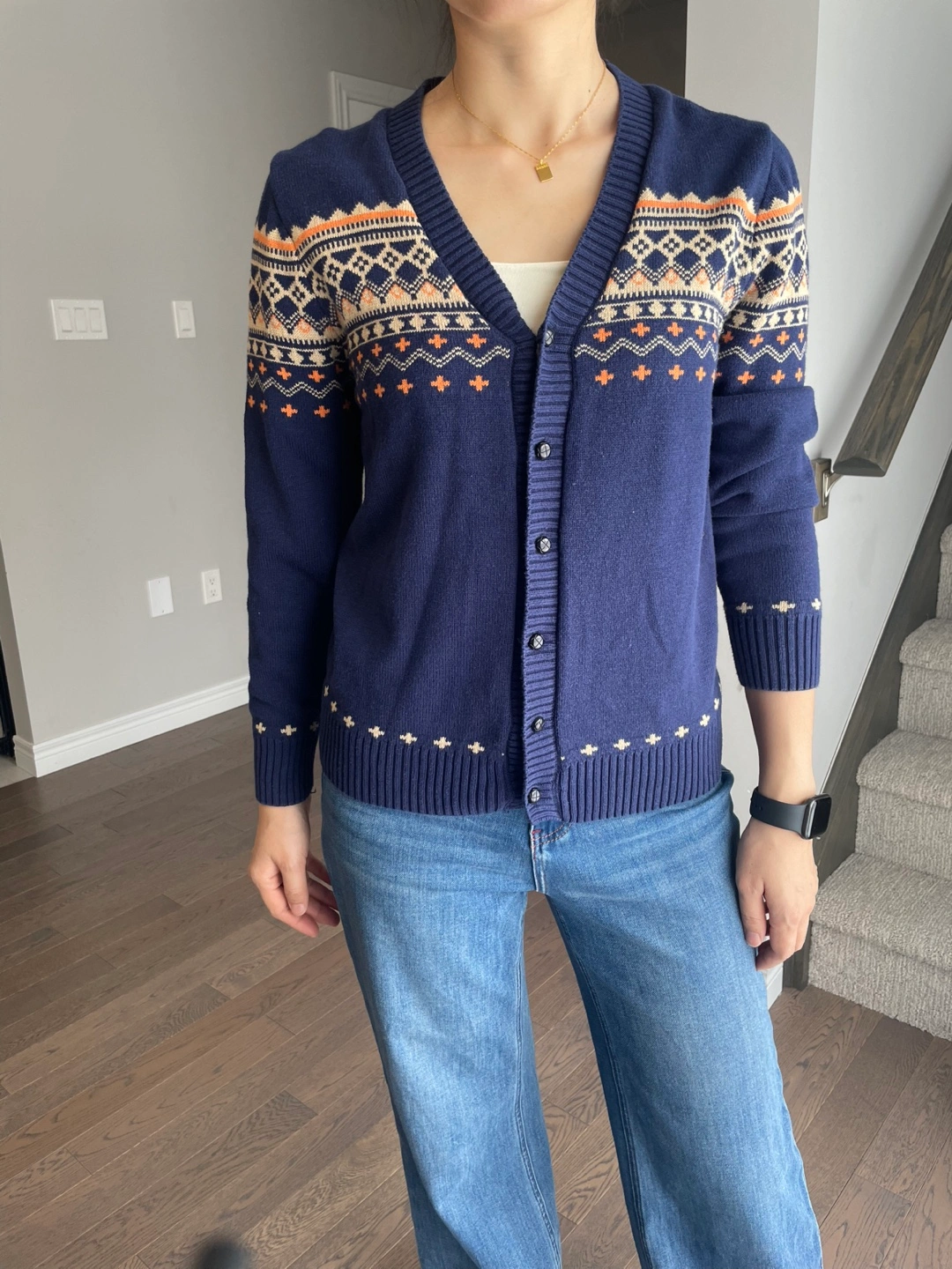 A lovely navy cardigan with a fair isle pattern! It's in great condition and perfect for layering on chilly days Pick up at ancaster Hamilton !