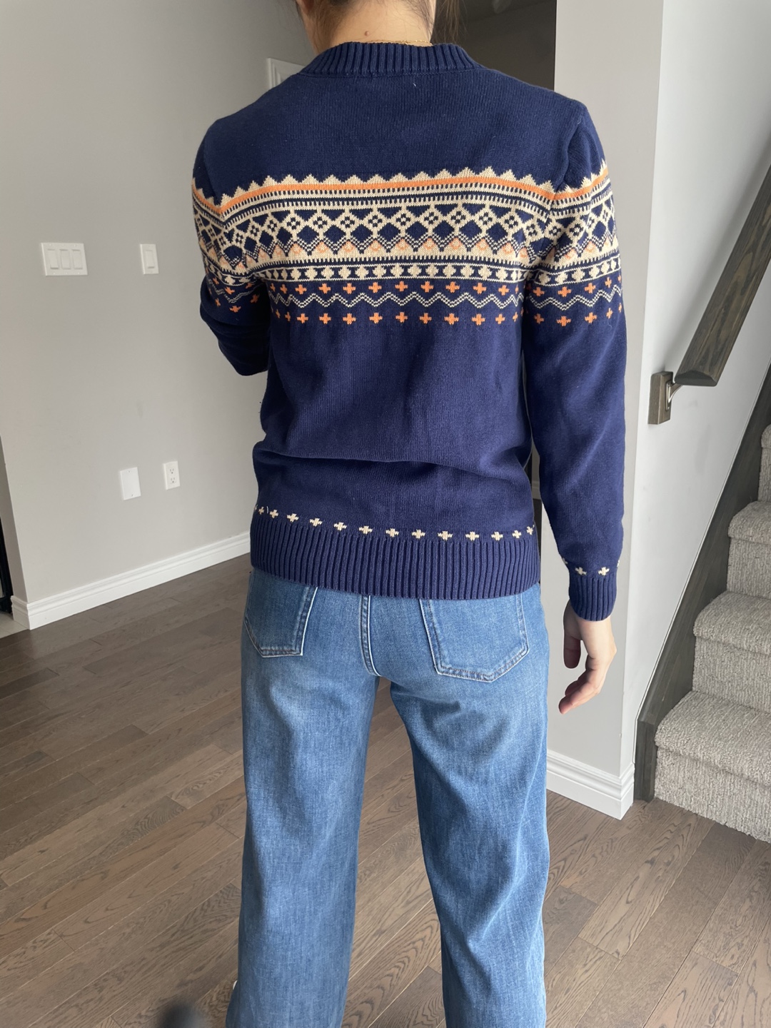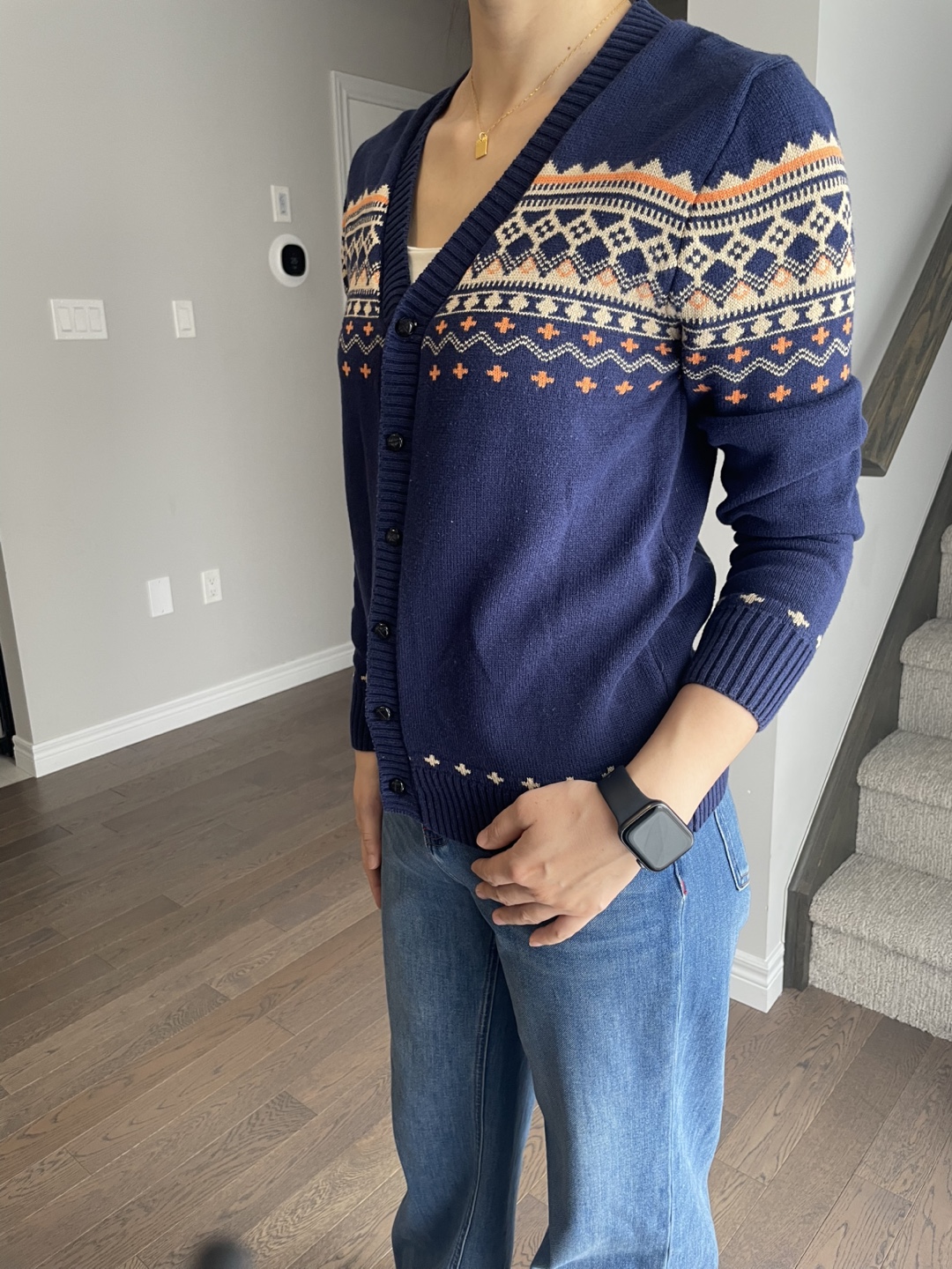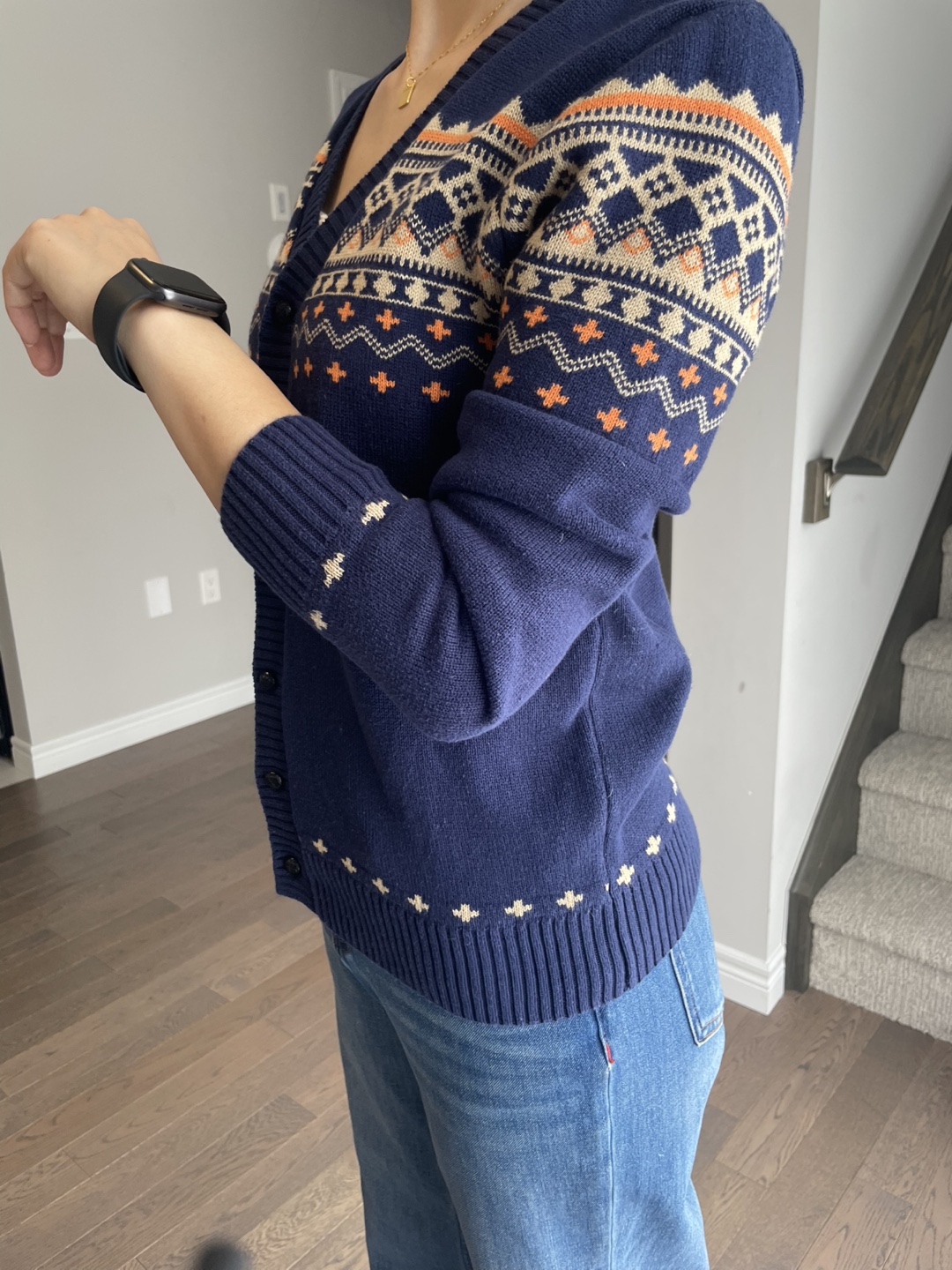 A lovely navy cardigan with a fair isle pattern! It's in great condition and perfect for layering on chilly days Pick up at ancaster Hamilton !