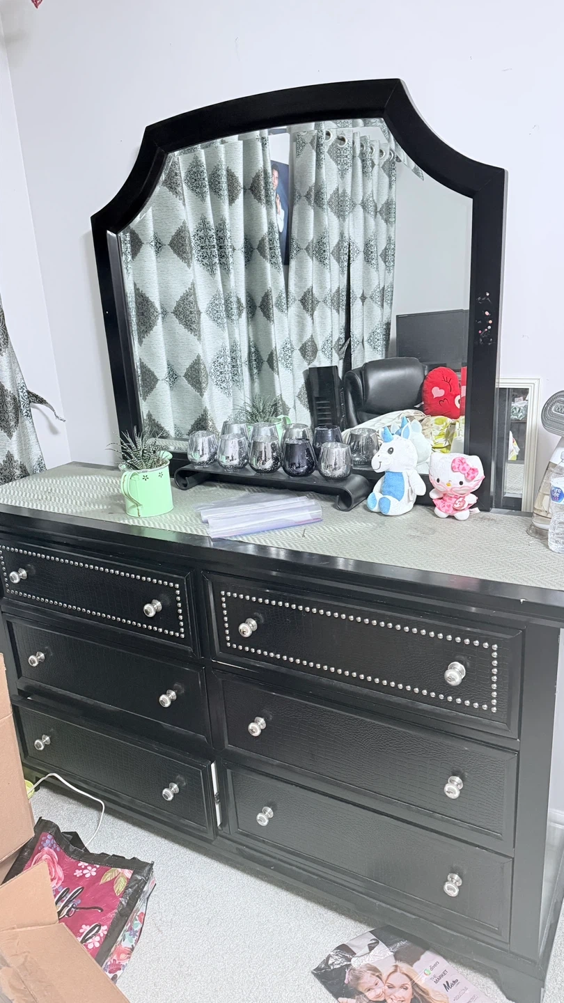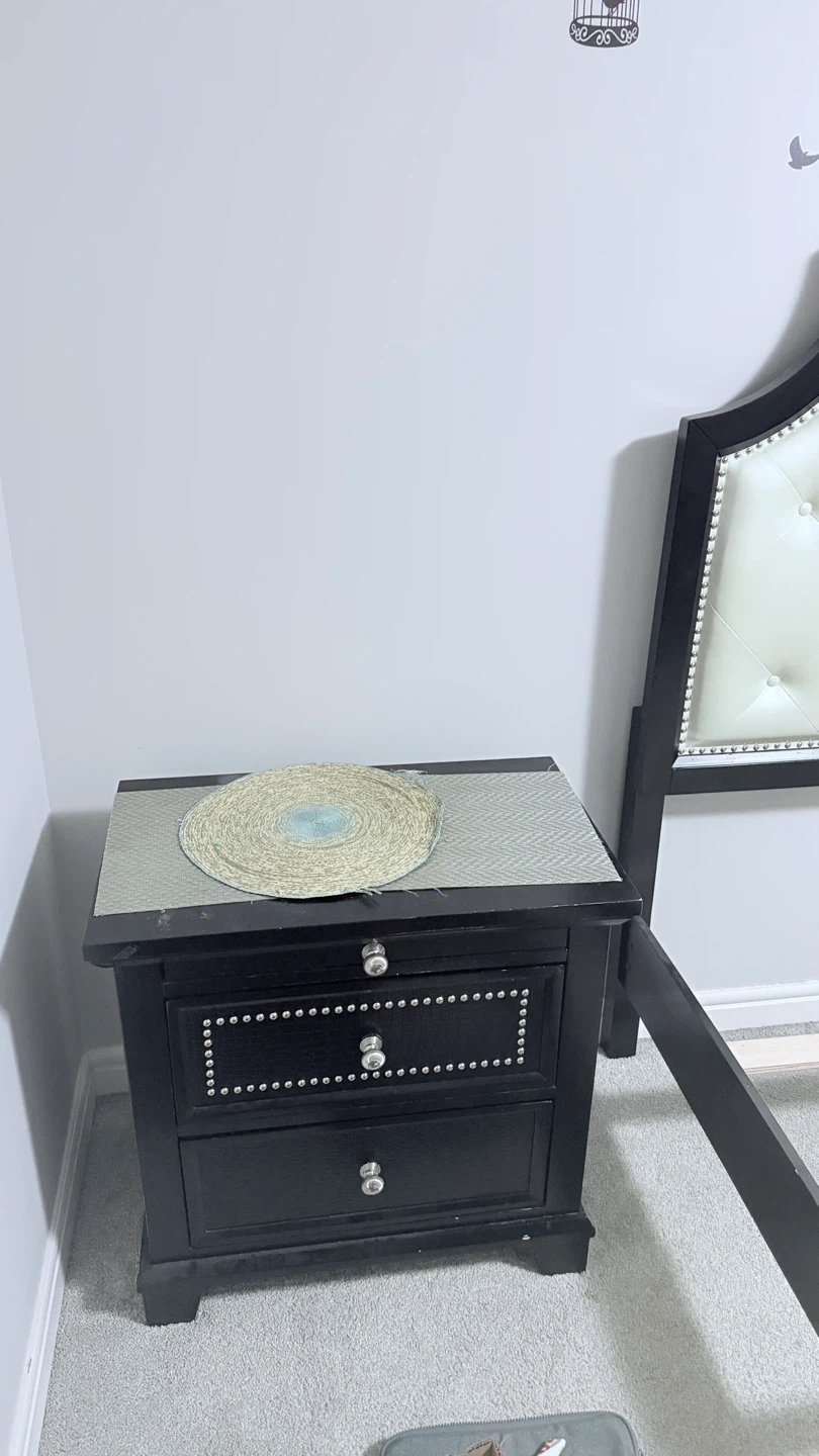 Selling a Queen bedroom set that includes a bed frame, dresser, and two nightstands. The furniture is black with silver accents and a white headboard. Perfect for a bedroom makeover!