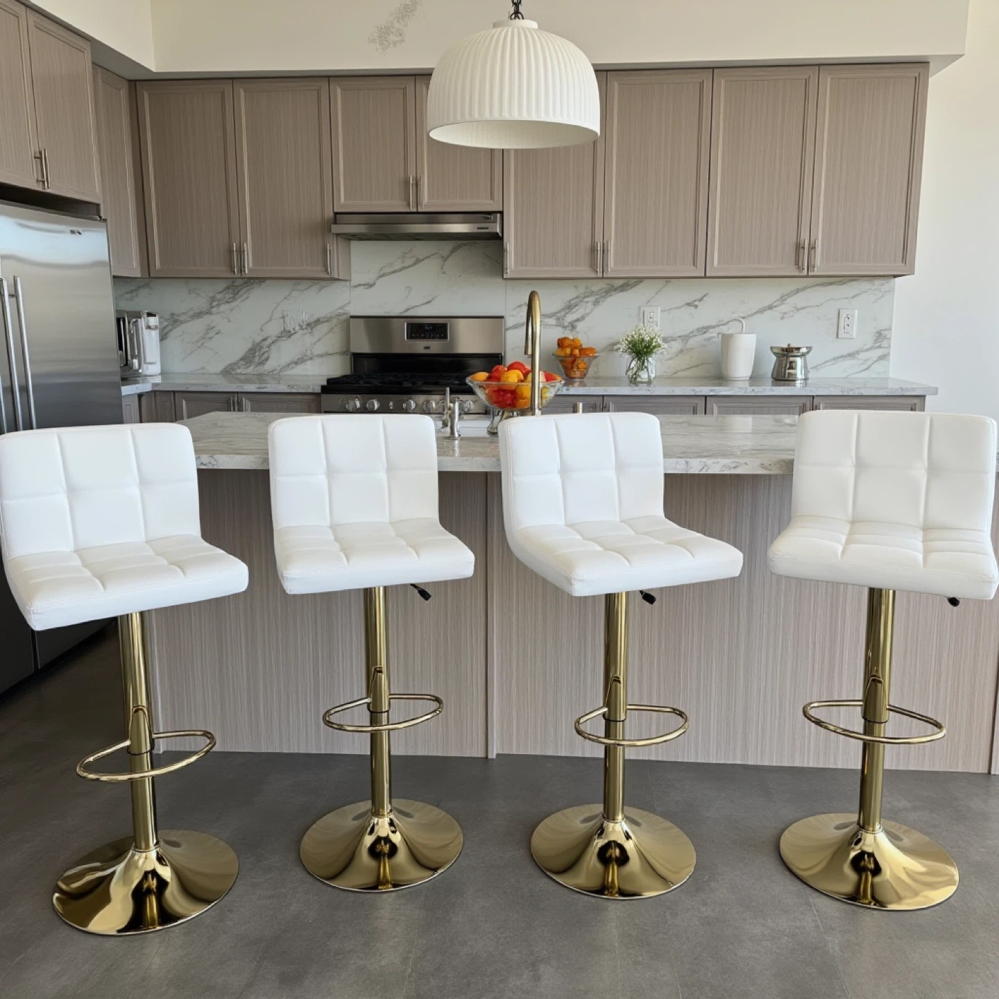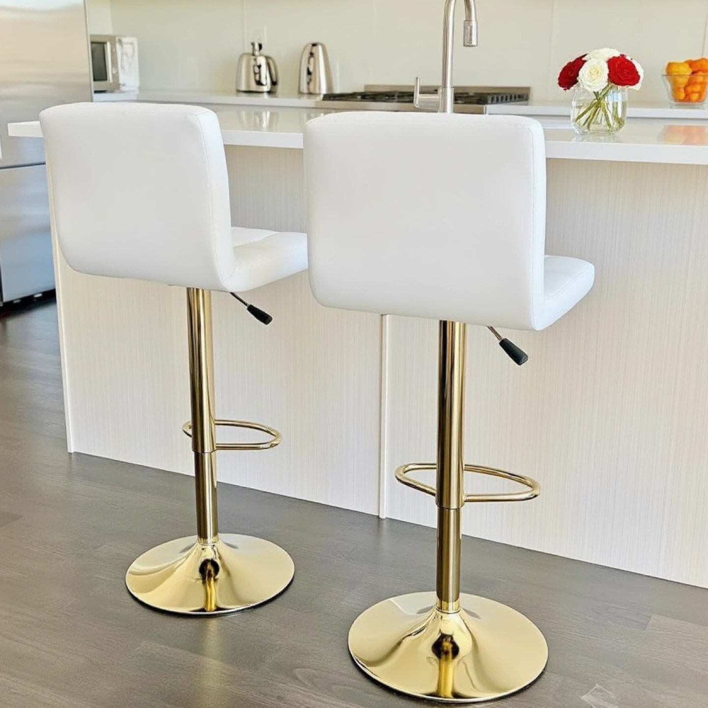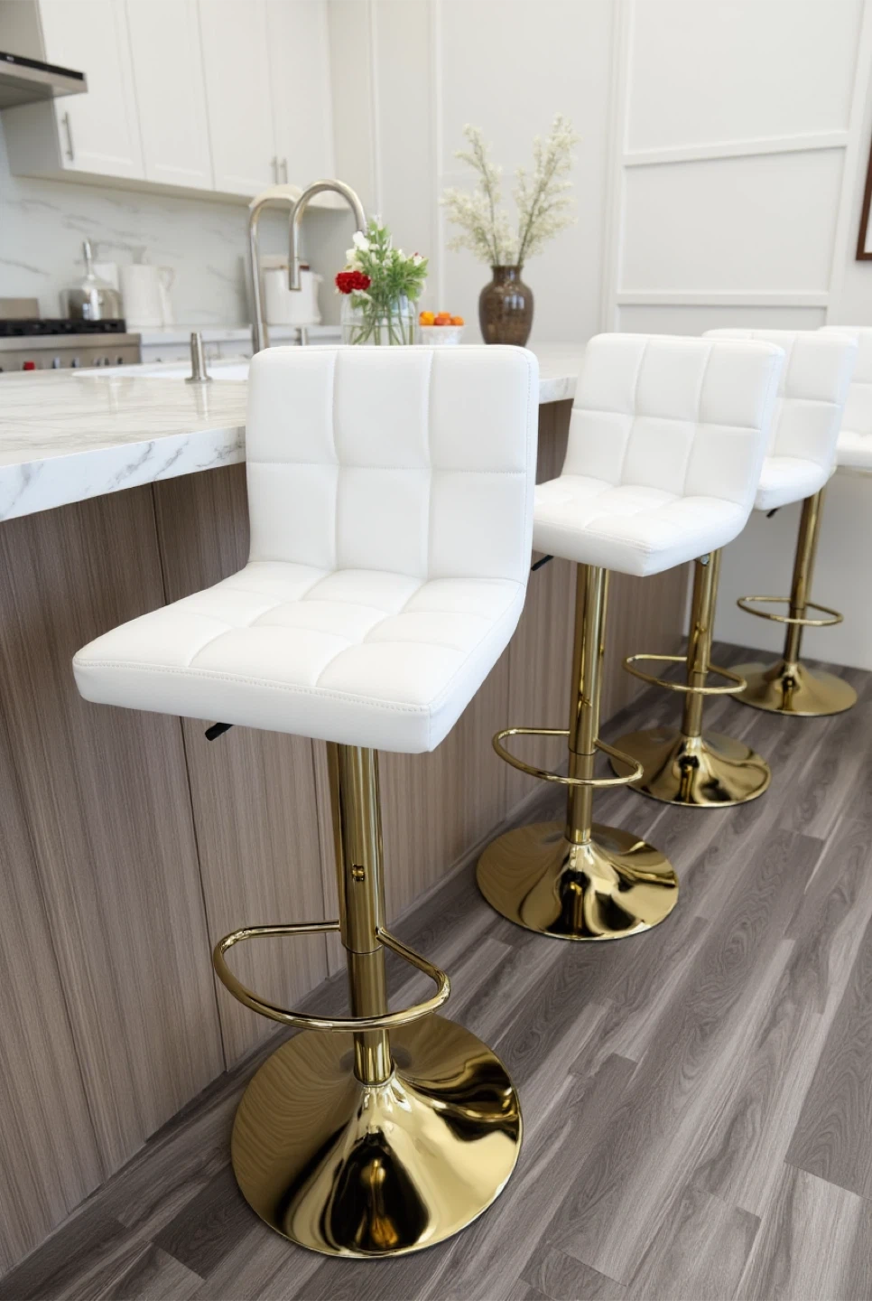 Looking to add a touch of glam to your kitchen? I'm selling a set of four stylish bar stools! They feature a sleek white seat and a shiny gold base, perfect for any modern kitchen or bar area. They are in great condition and ready to elevate your space!