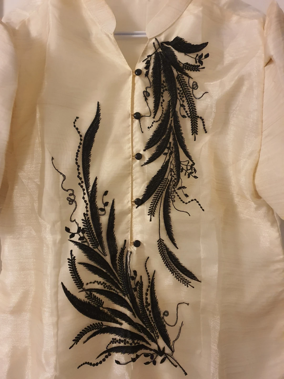 Beautiful cream-coloured Filipiniana dress with elegant black embroidery. Perfect for special occasions or cultural events. It's unused and in great condition and ready for a new home!
