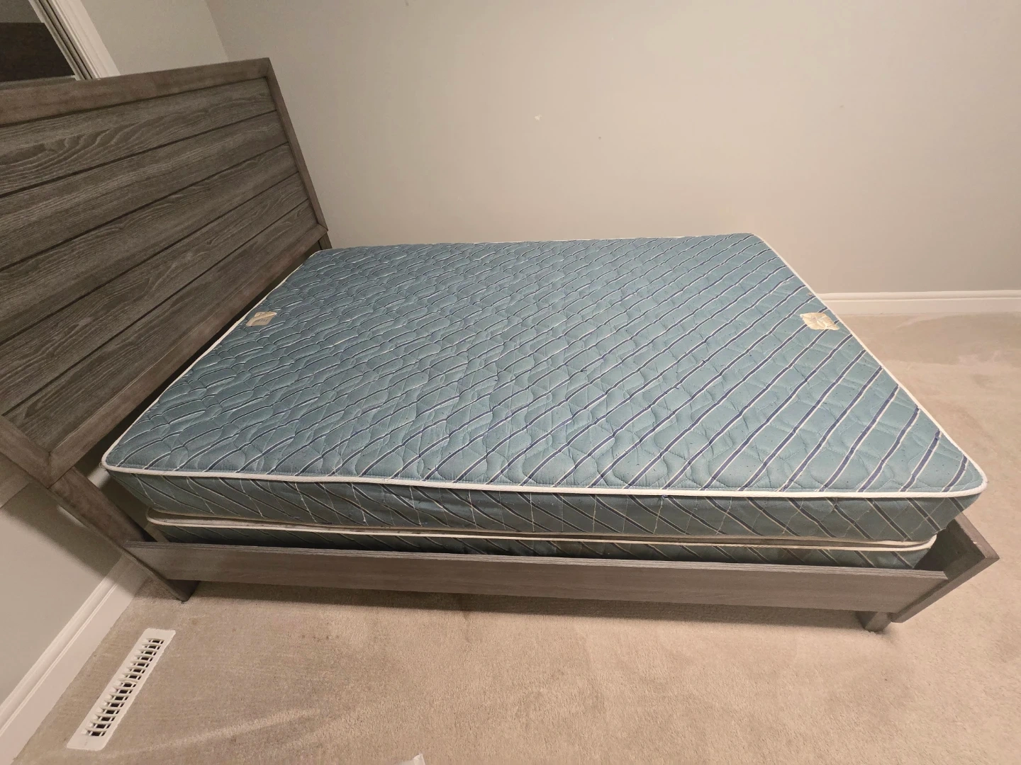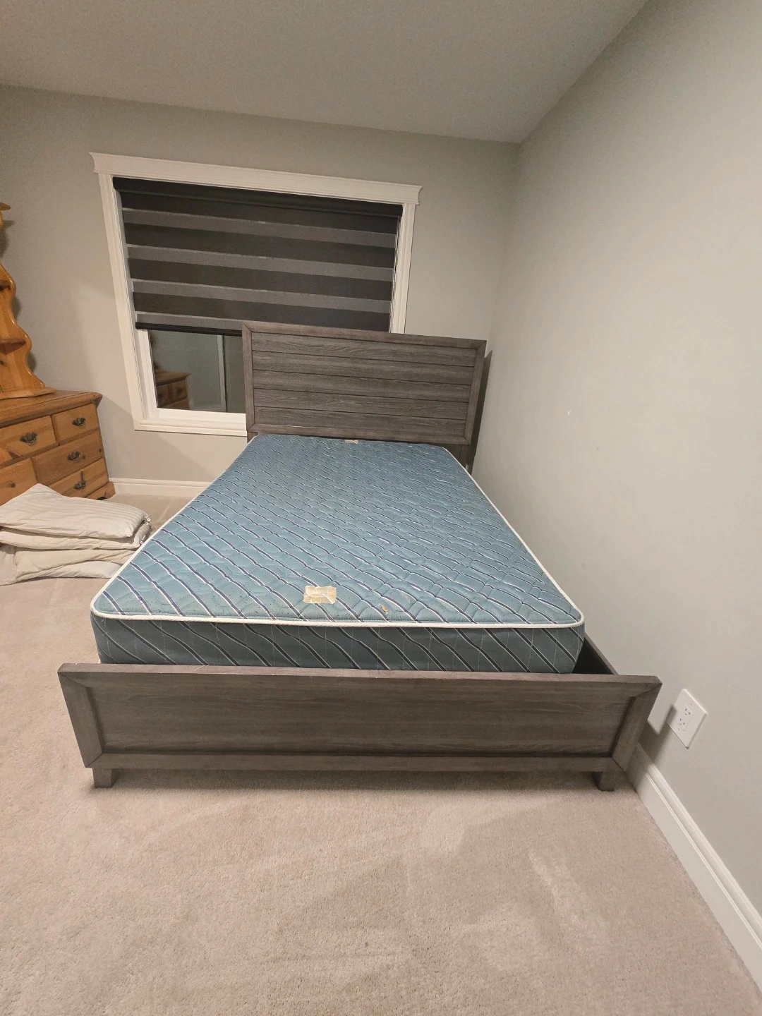 Selling a queen size bed frame with a mattress. The bed frame is a greyish colour with a wood grain design. The mattress is quilted and in good condition!
