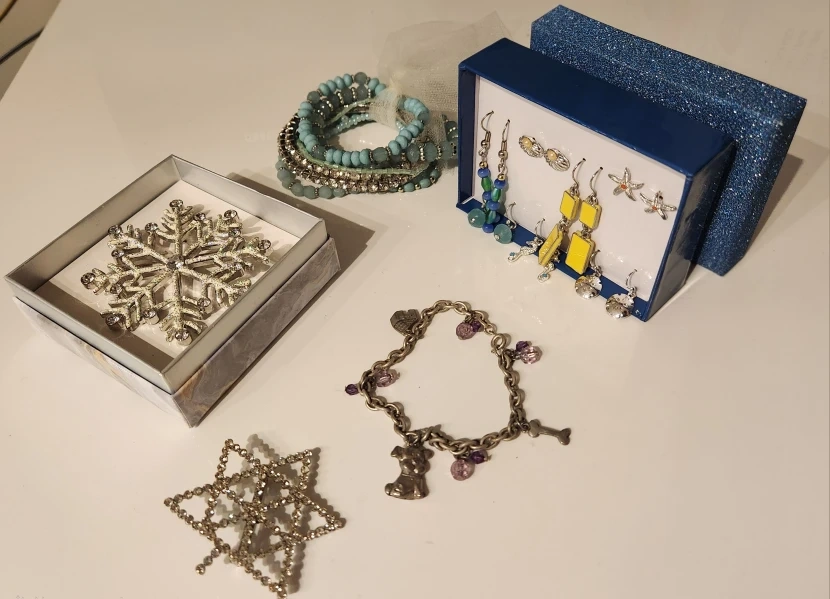 Selling a collection of jewellery! Included are a few bracelets, a snowflake brooch, and a set of earrings in a blue box