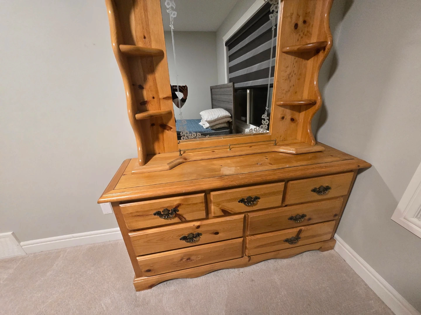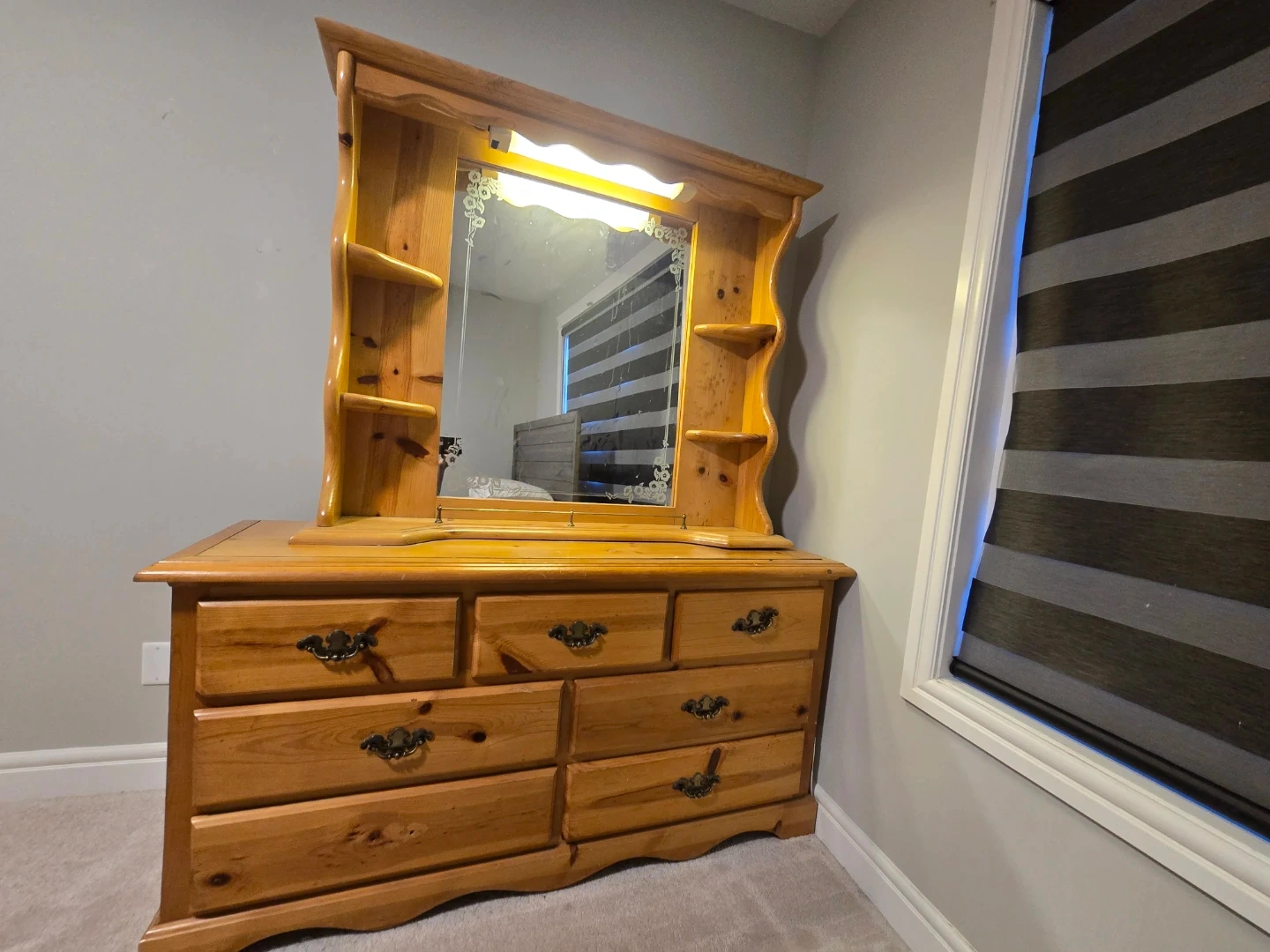 Here's a lovely wooden dresser with an attached mirror! It features seven drawers and a charming, rustic design. Perfect for adding storage and character to any bedroom